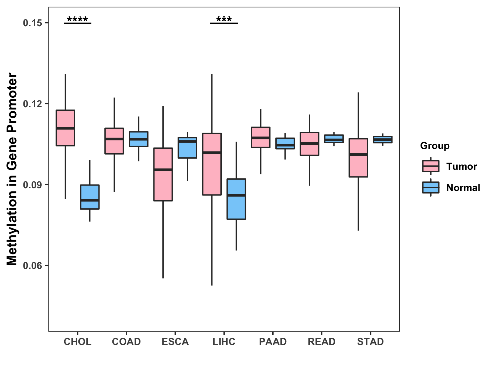 Boxplot of All Gastrointestinal Cancer ( * : 0.01-0.05 , ** : 0.005-0.01 , *** : 0.0001-0.005 , **** : < 0.0001 ) |