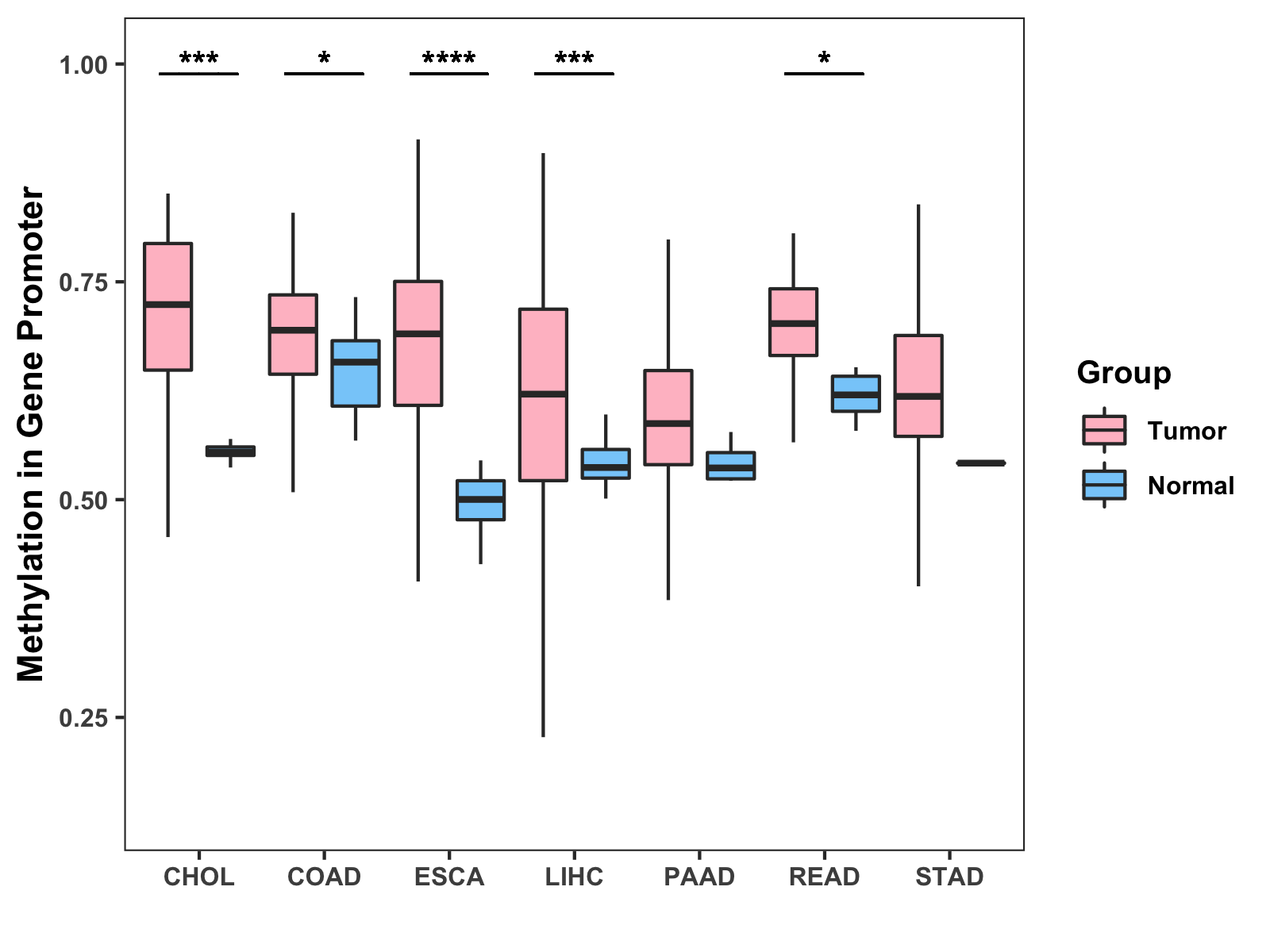 Boxplot of All Gastrointestinal Cancer ( * : 0.01-0.05 , ** : 0.005-0.01 , *** : 0.0001-0.005 , **** : < 0.0001 ) |
