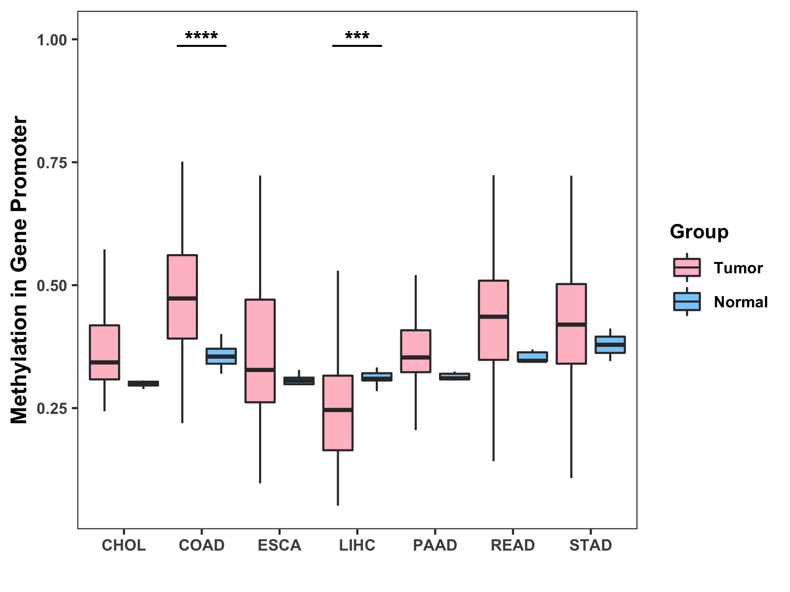 Boxplot of All Gastrointestinal Cancer ( * : 0.01-0.05 , ** : 0.005-0.01 , *** : 0.0001-0.005 , **** : < 0.0001 ) |