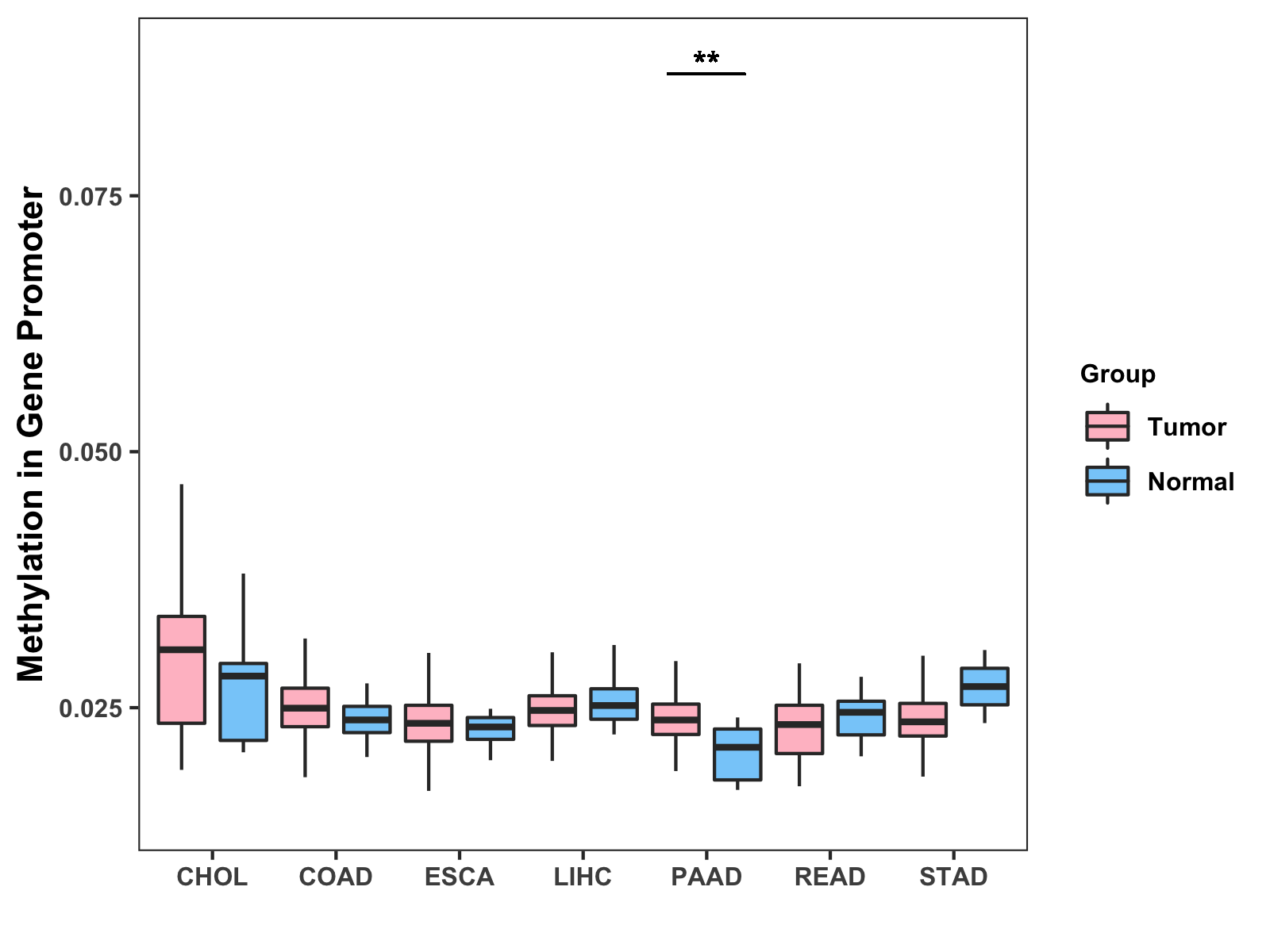 Boxplot of All Gastrointestinal Cancer ( * : 0.01-0.05 , ** : 0.005-0.01 , *** : 0.0001-0.005 , **** : < 0.0001 ) |