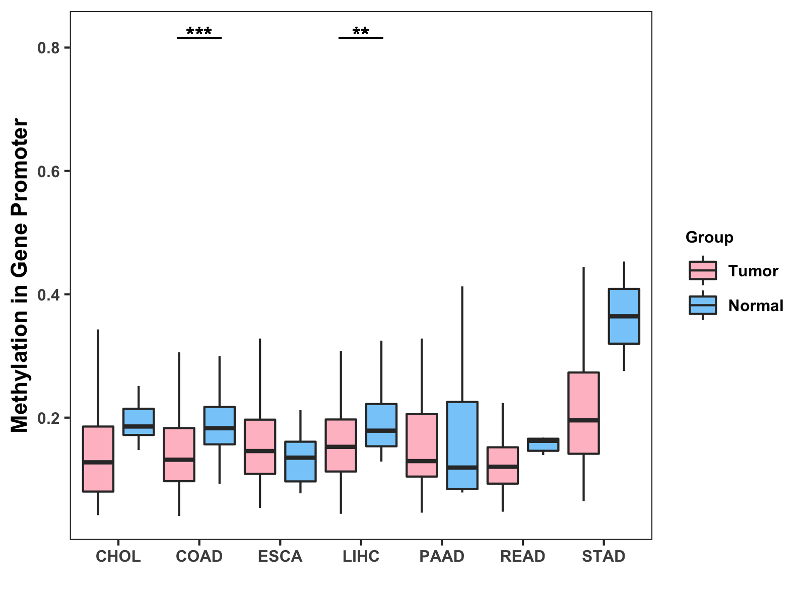 Boxplot of All Gastrointestinal Cancer ( * : 0.01-0.05 , ** : 0.005-0.01 , *** : 0.0001-0.005 , **** : < 0.0001 ) |