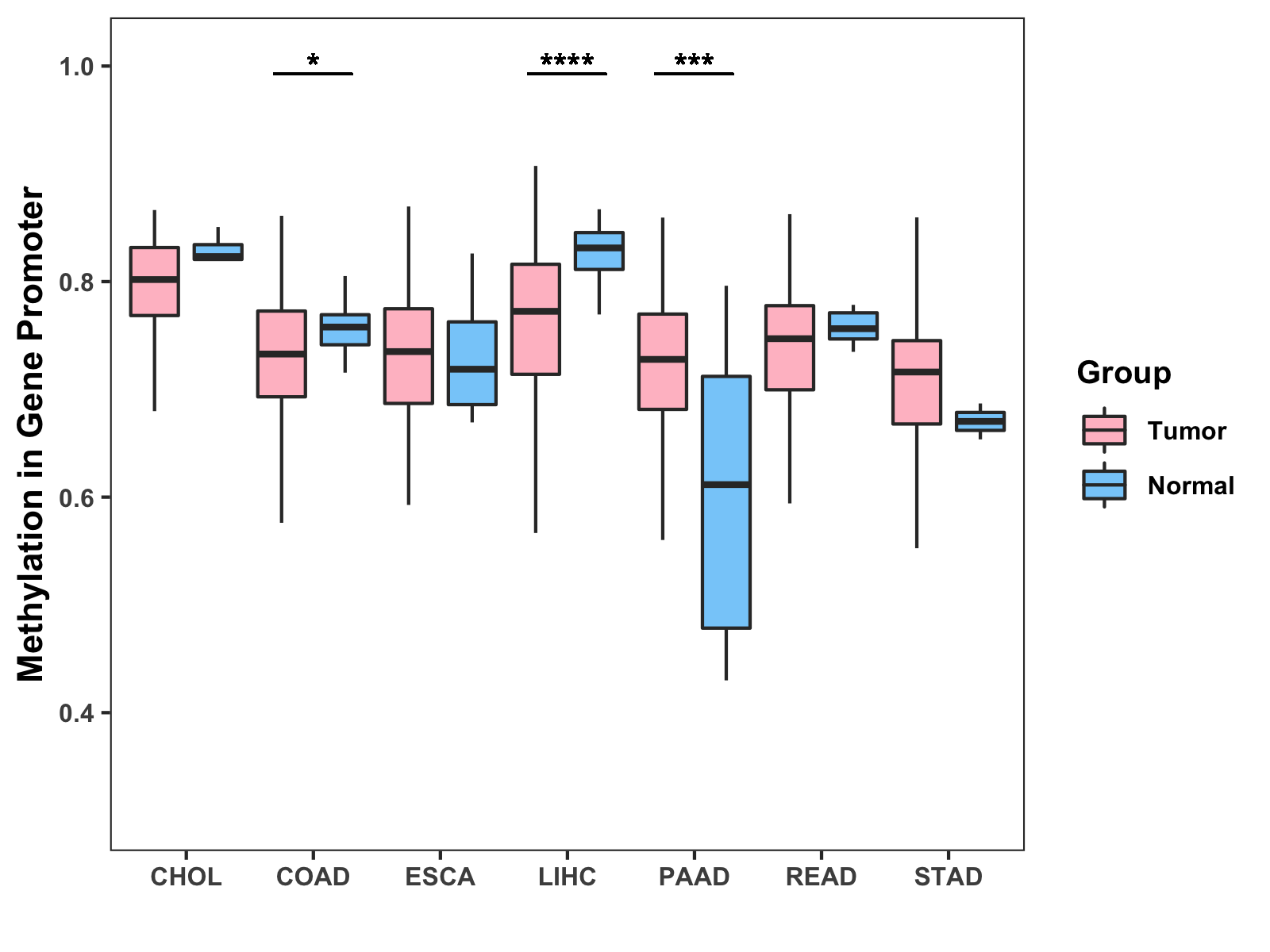 Boxplot of All Gastrointestinal Cancer ( * : 0.01-0.05 , ** : 0.005-0.01 , *** : 0.0001-0.005 , **** : < 0.0001 ) |