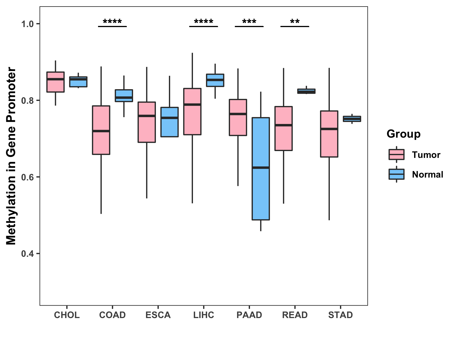 Boxplot of All Gastrointestinal Cancer ( * : 0.01-0.05 , ** : 0.005-0.01 , *** : 0.0001-0.005 , **** : < 0.0001 ) |