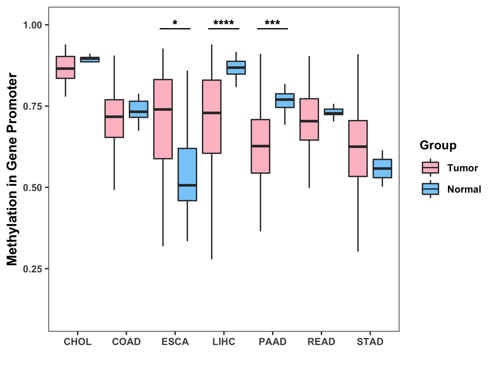 Boxplot of All Gastrointestinal Cancer ( * : 0.01-0.05 , ** : 0.005-0.01 , *** : 0.0001-0.005 , **** : < 0.0001 ) |