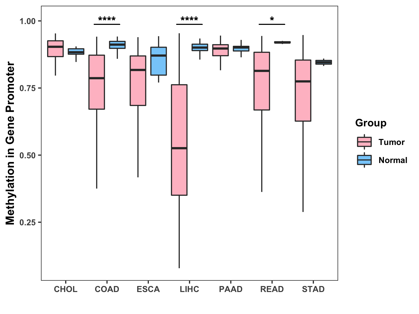 Boxplot of All Gastrointestinal Cancer ( * : 0.01-0.05 , ** : 0.005-0.01 , *** : 0.0001-0.005 , **** : < 0.0001 ) |