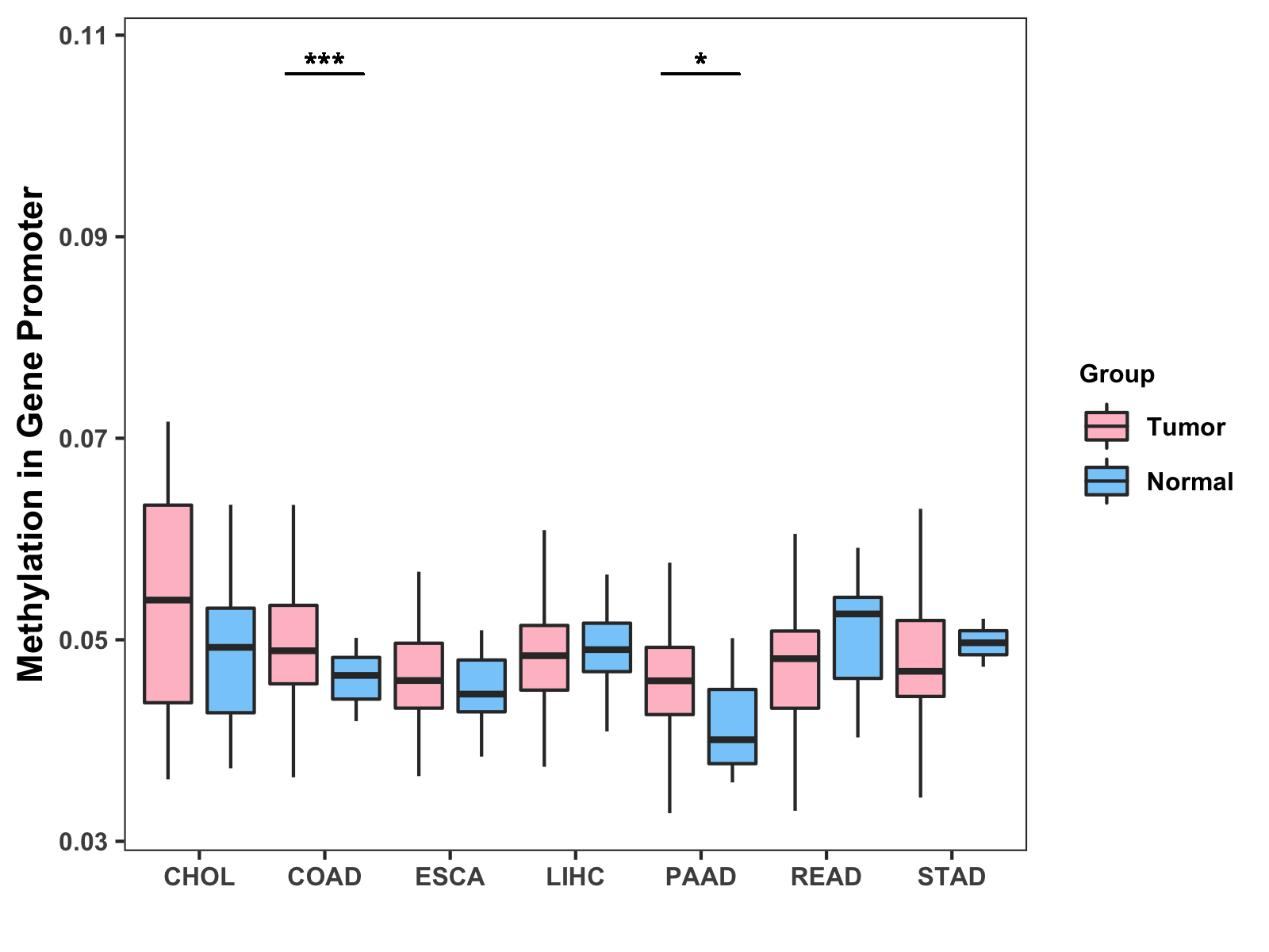 Boxplot of All Gastrointestinal Cancer ( * : 0.01-0.05 , ** : 0.005-0.01 , *** : 0.0001-0.005 , **** : < 0.0001 ) |