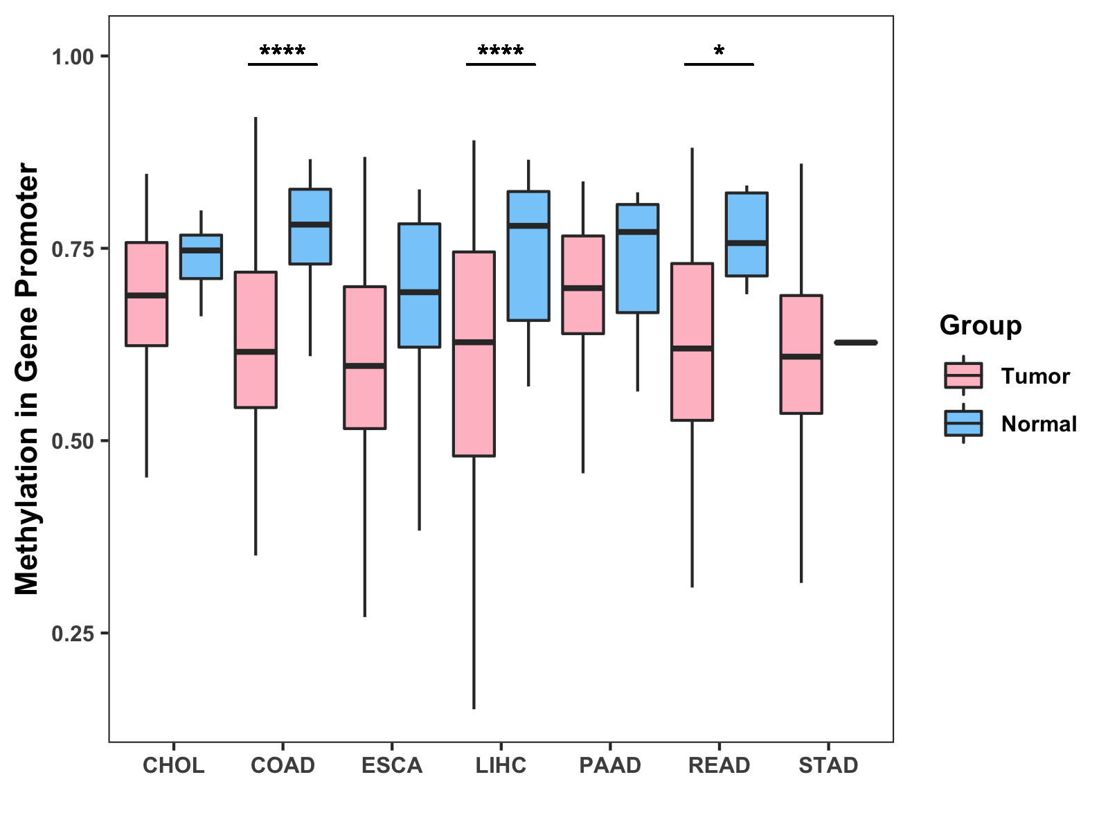 Boxplot of All Gastrointestinal Cancer ( * : 0.01-0.05 , ** : 0.005-0.01 , *** : 0.0001-0.005 , **** : < 0.0001 ) |