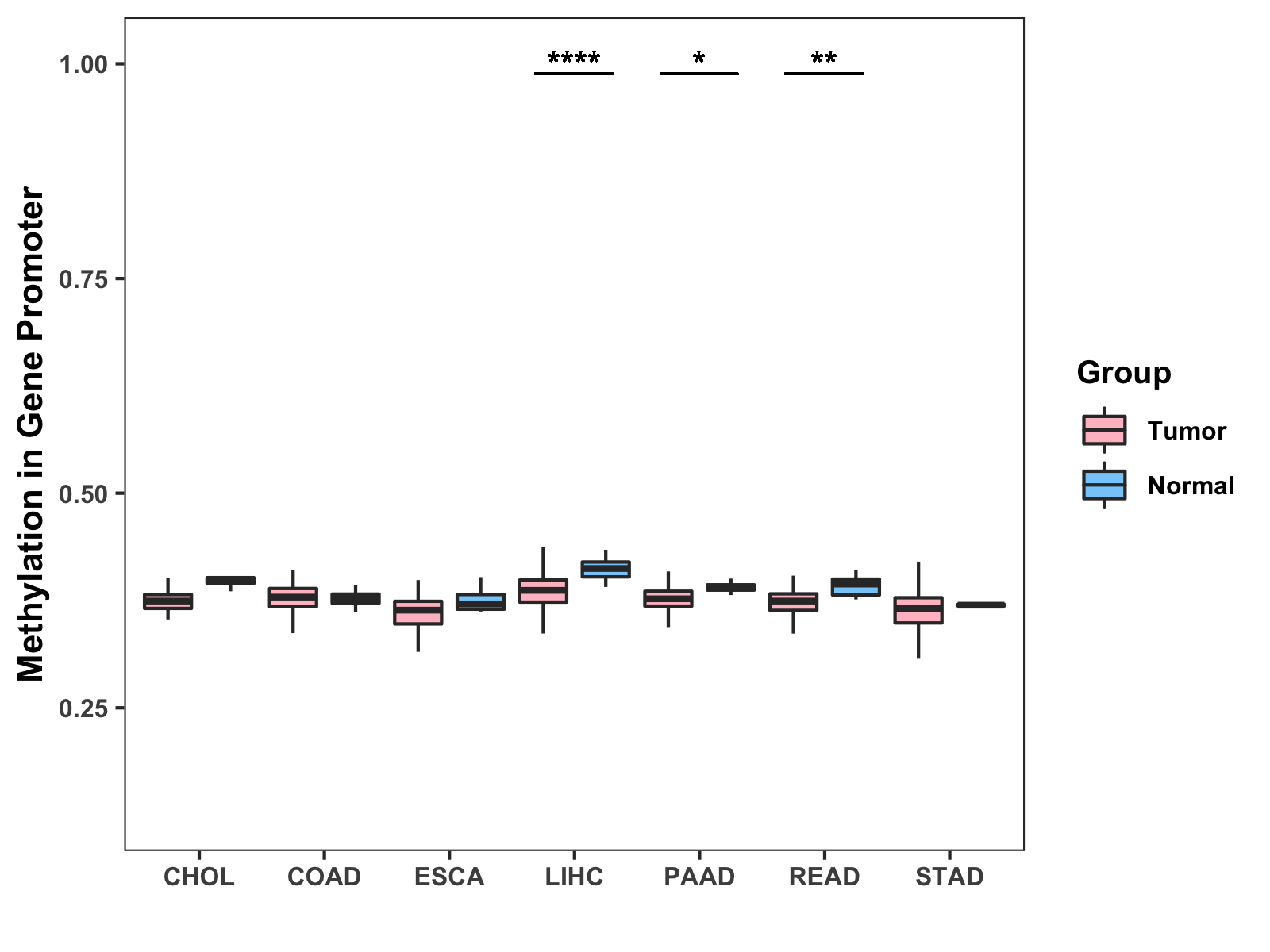 Boxplot of All Gastrointestinal Cancer ( * : 0.01-0.05 , ** : 0.005-0.01 , *** : 0.0001-0.005 , **** : < 0.0001 ) |