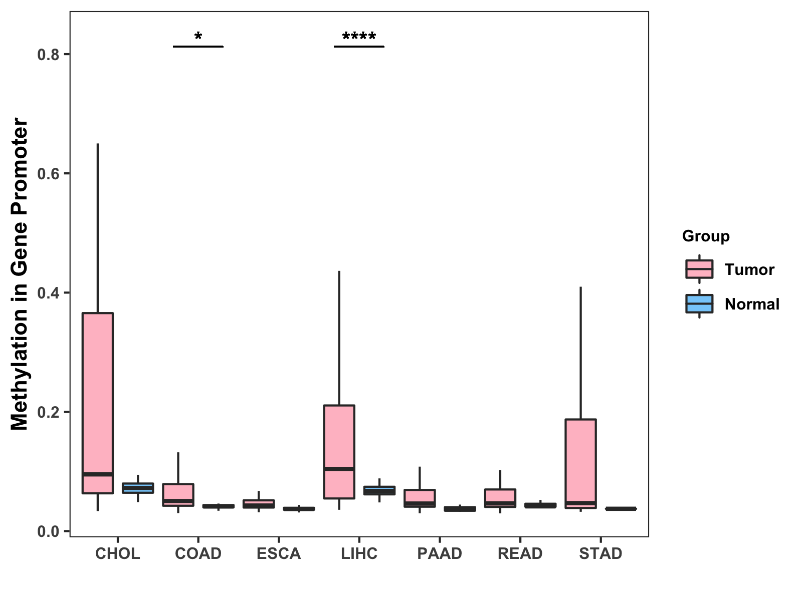Boxplot of All Gastrointestinal Cancer ( * : 0.01-0.05 , ** : 0.005-0.01 , *** : 0.0001-0.005 , **** : < 0.0001 ) |