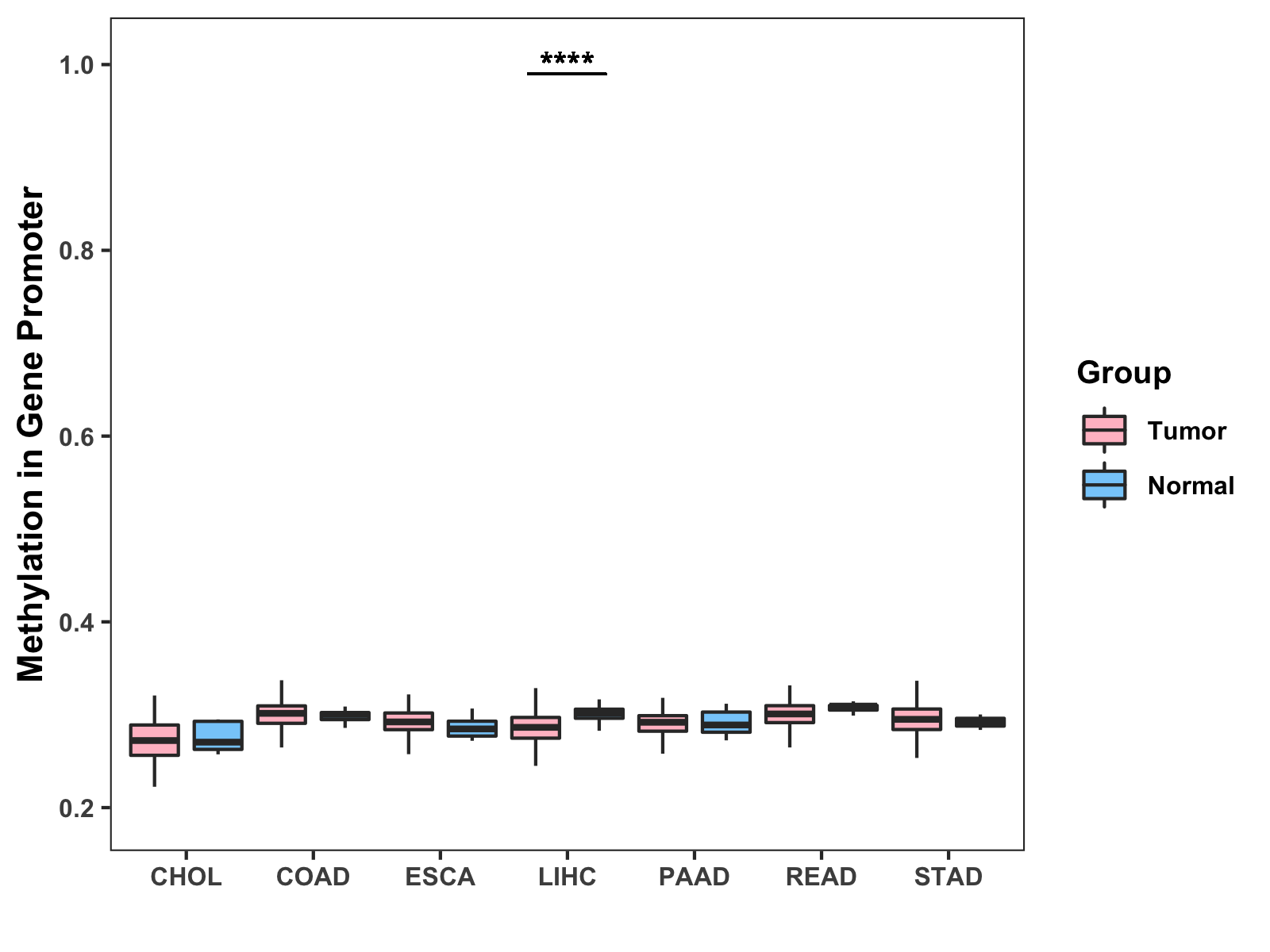 Boxplot of All Gastrointestinal Cancer ( * : 0.01-0.05 , ** : 0.005-0.01 , *** : 0.0001-0.005 , **** : < 0.0001 ) |