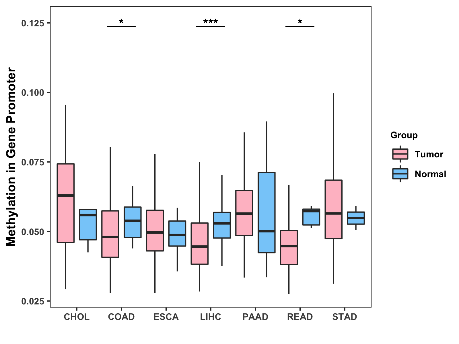 Boxplot of All Gastrointestinal Cancer ( * : 0.01-0.05 , ** : 0.005-0.01 , *** : 0.0001-0.005 , **** : < 0.0001 ) |