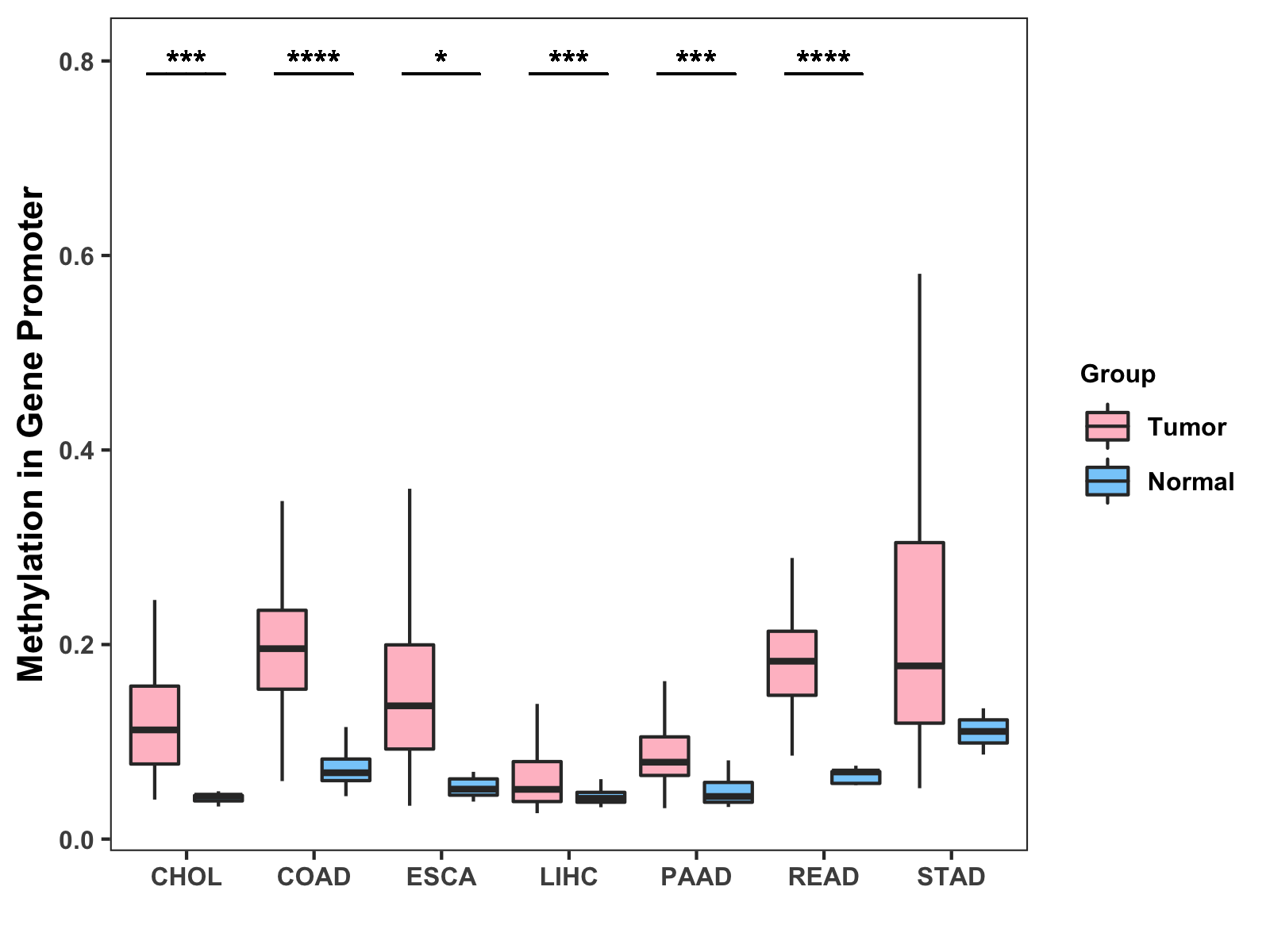 Boxplot of All Gastrointestinal Cancer ( * : 0.01-0.05 , ** : 0.005-0.01 , *** : 0.0001-0.005 , **** : < 0.0001 ) |