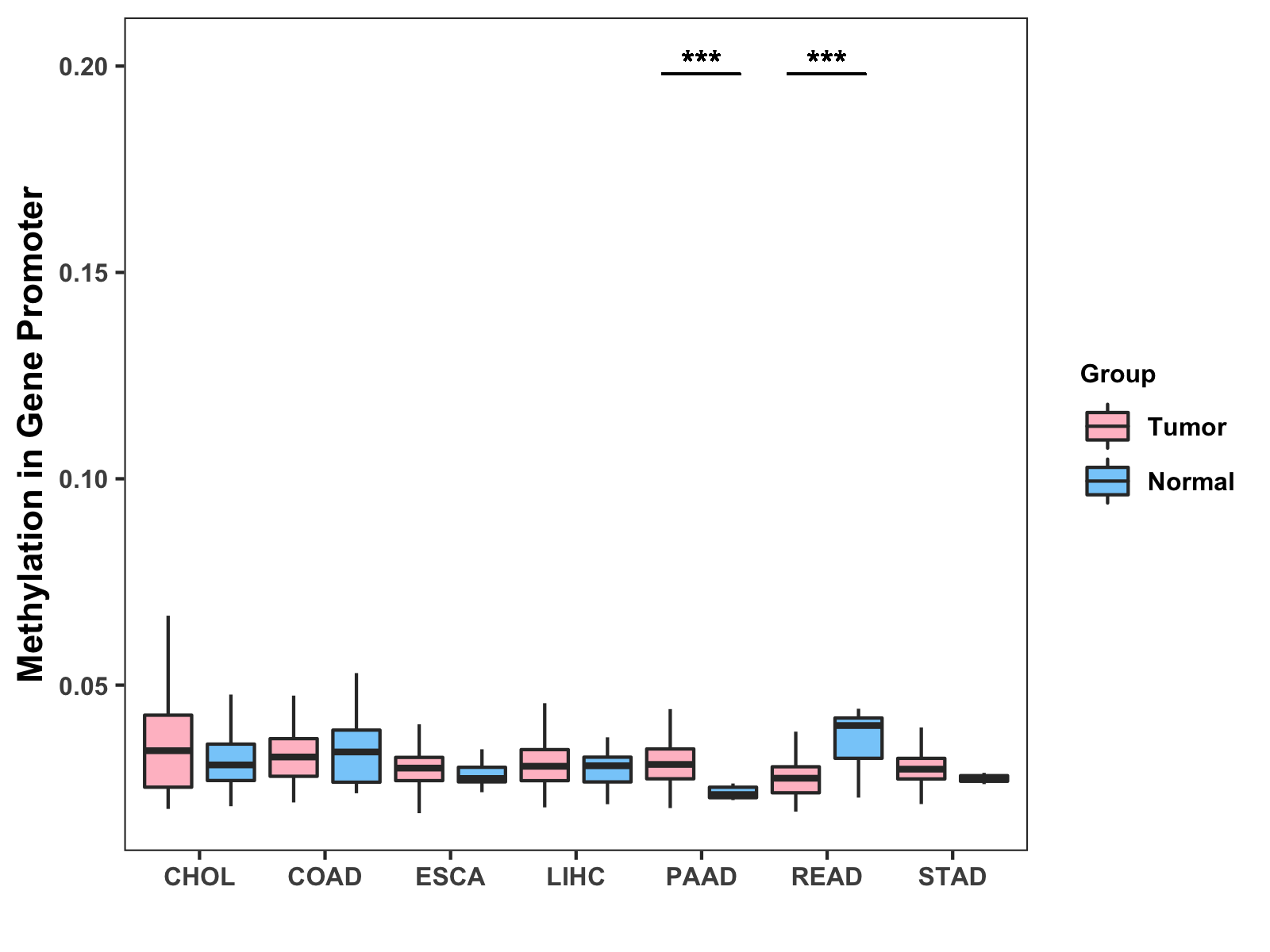 Boxplot of All Gastrointestinal Cancer ( * : 0.01-0.05 , ** : 0.005-0.01 , *** : 0.0001-0.005 , **** : < 0.0001 ) |