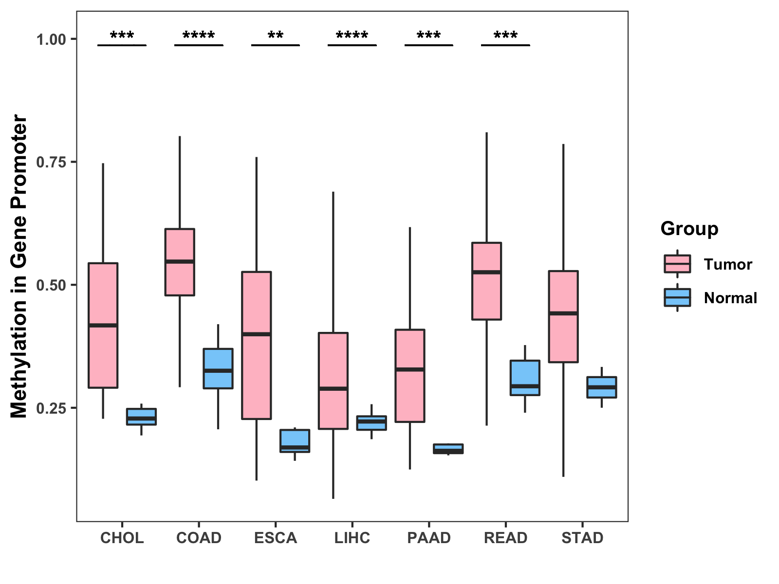 Boxplot of All Gastrointestinal Cancer ( * : 0.01-0.05 , ** : 0.005-0.01 , *** : 0.0001-0.005 , **** : < 0.0001 ) |