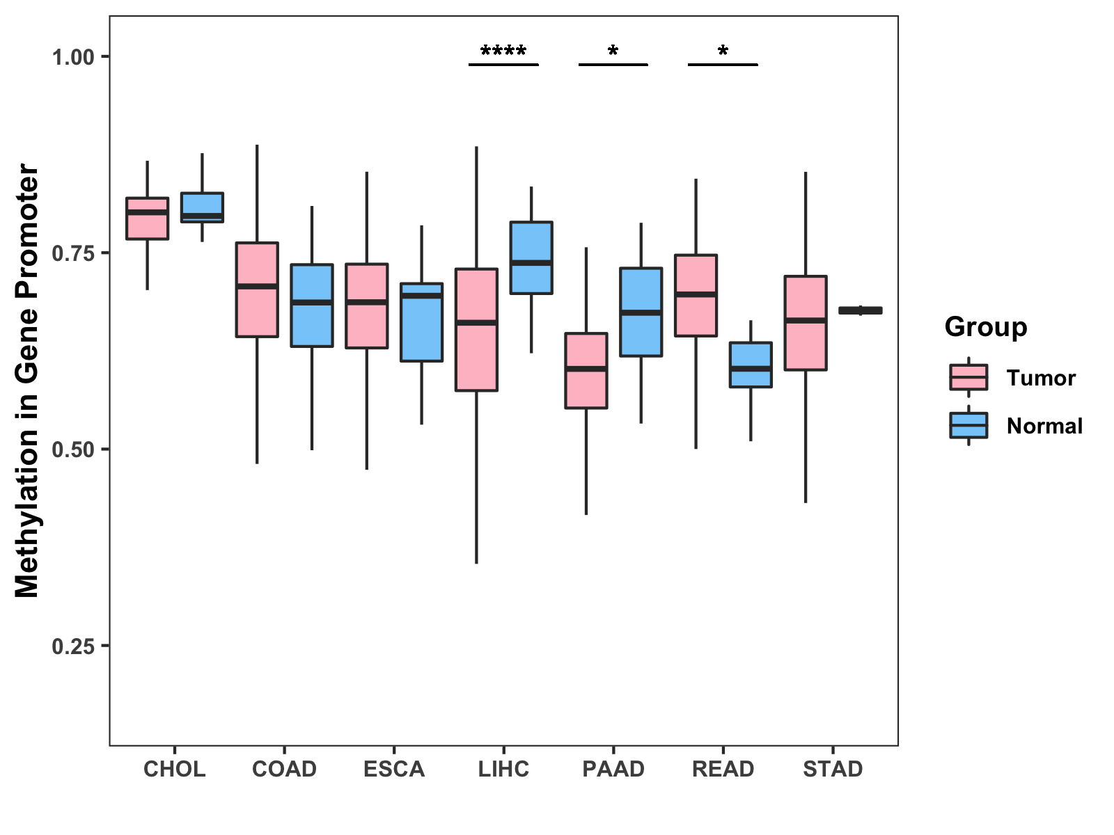 Boxplot of All Gastrointestinal Cancer ( * : 0.01-0.05 , ** : 0.005-0.01 , *** : 0.0001-0.005 , **** : < 0.0001 ) |