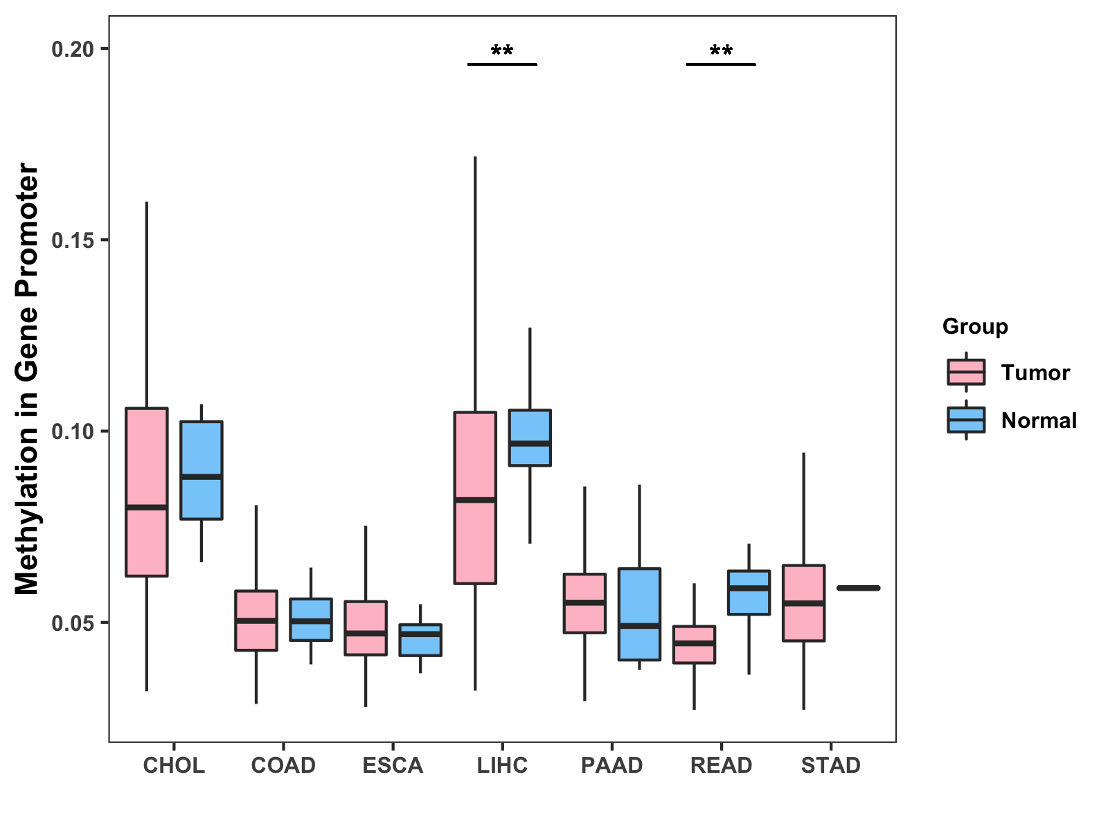 Boxplot of All Gastrointestinal Cancer ( * : 0.01-0.05 , ** : 0.005-0.01 , *** : 0.0001-0.005 , **** : < 0.0001 ) |
