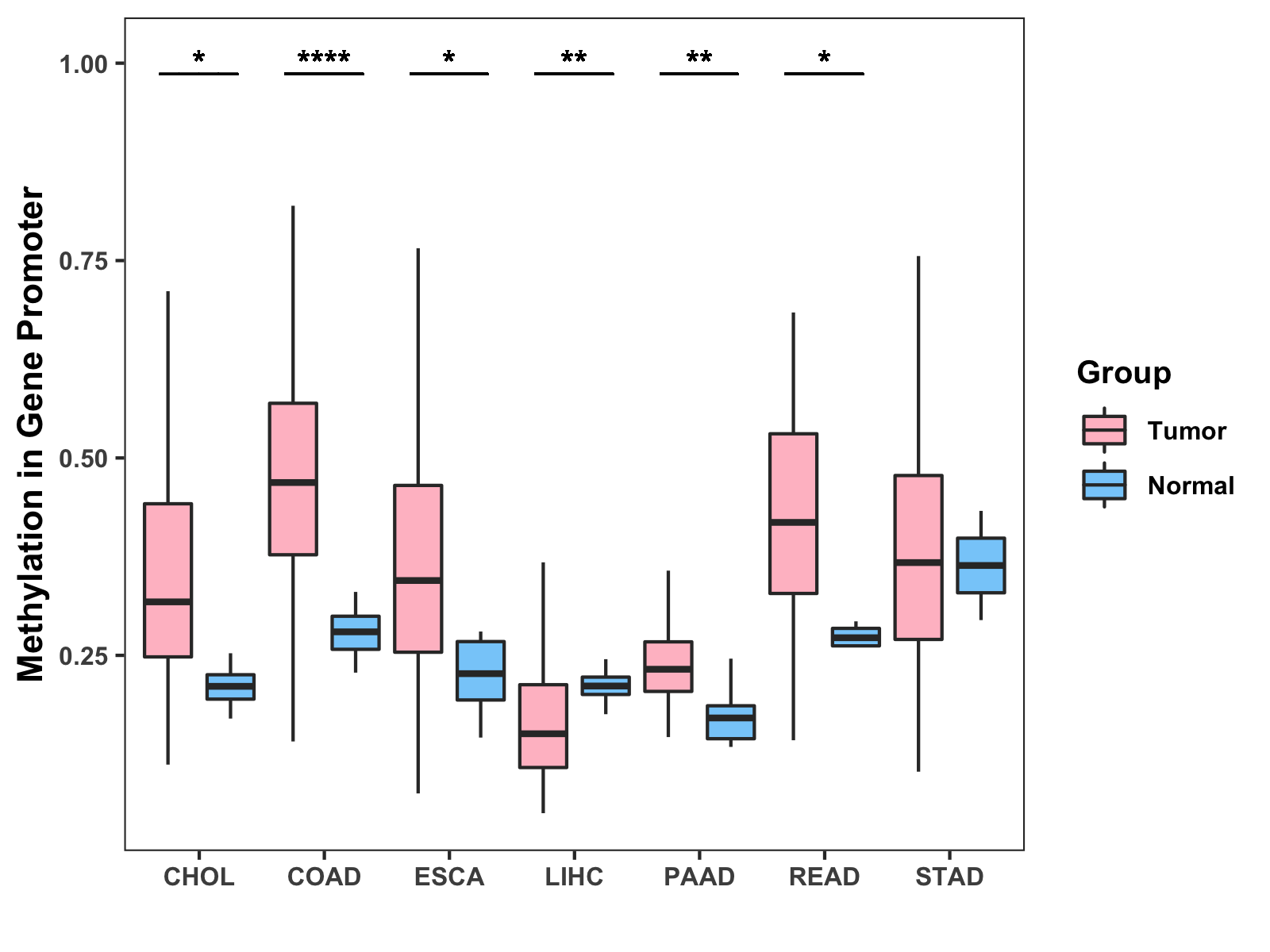 Boxplot of All Gastrointestinal Cancer ( * : 0.01-0.05 , ** : 0.005-0.01 , *** : 0.0001-0.005 , **** : < 0.0001 ) |