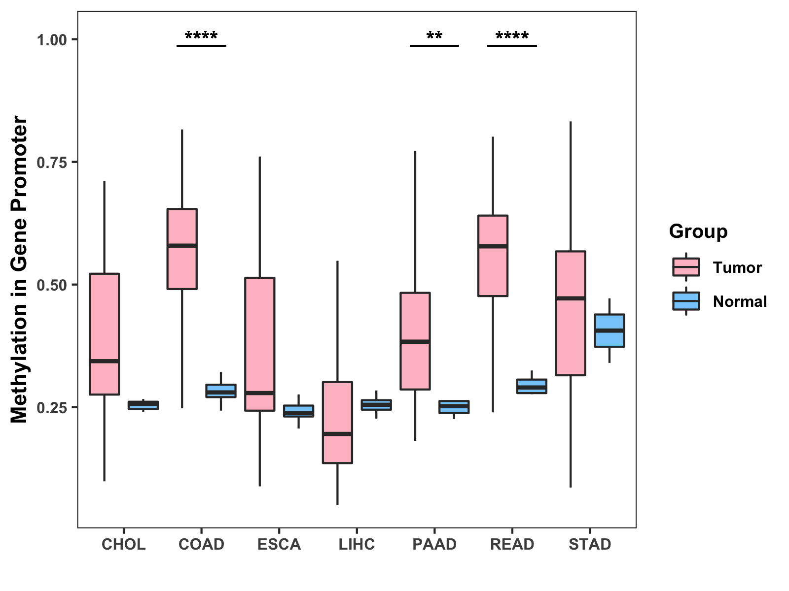 Boxplot of All Gastrointestinal Cancer ( * : 0.01-0.05 , ** : 0.005-0.01 , *** : 0.0001-0.005 , **** : < 0.0001 ) |