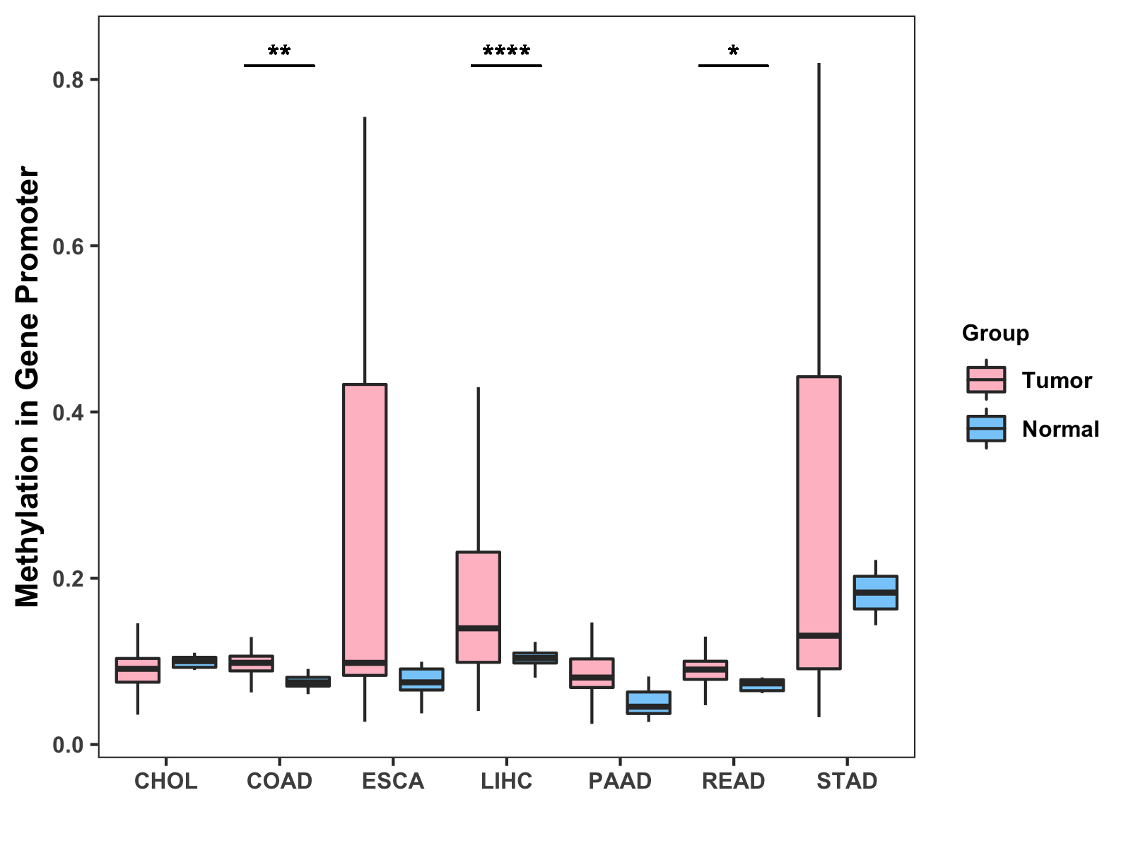 Boxplot of All Gastrointestinal Cancer ( * : 0.01-0.05 , ** : 0.005-0.01 , *** : 0.0001-0.005 , **** : < 0.0001 ) |