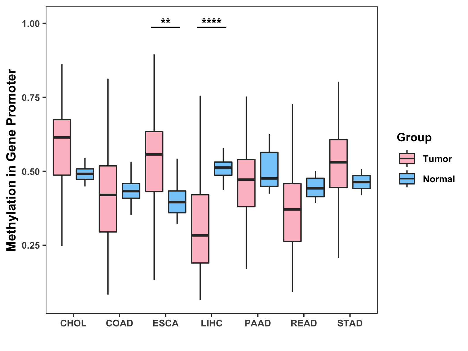 Boxplot of All Gastrointestinal Cancer ( * : 0.01-0.05 , ** : 0.005-0.01 , *** : 0.0001-0.005 , **** : < 0.0001 ) |