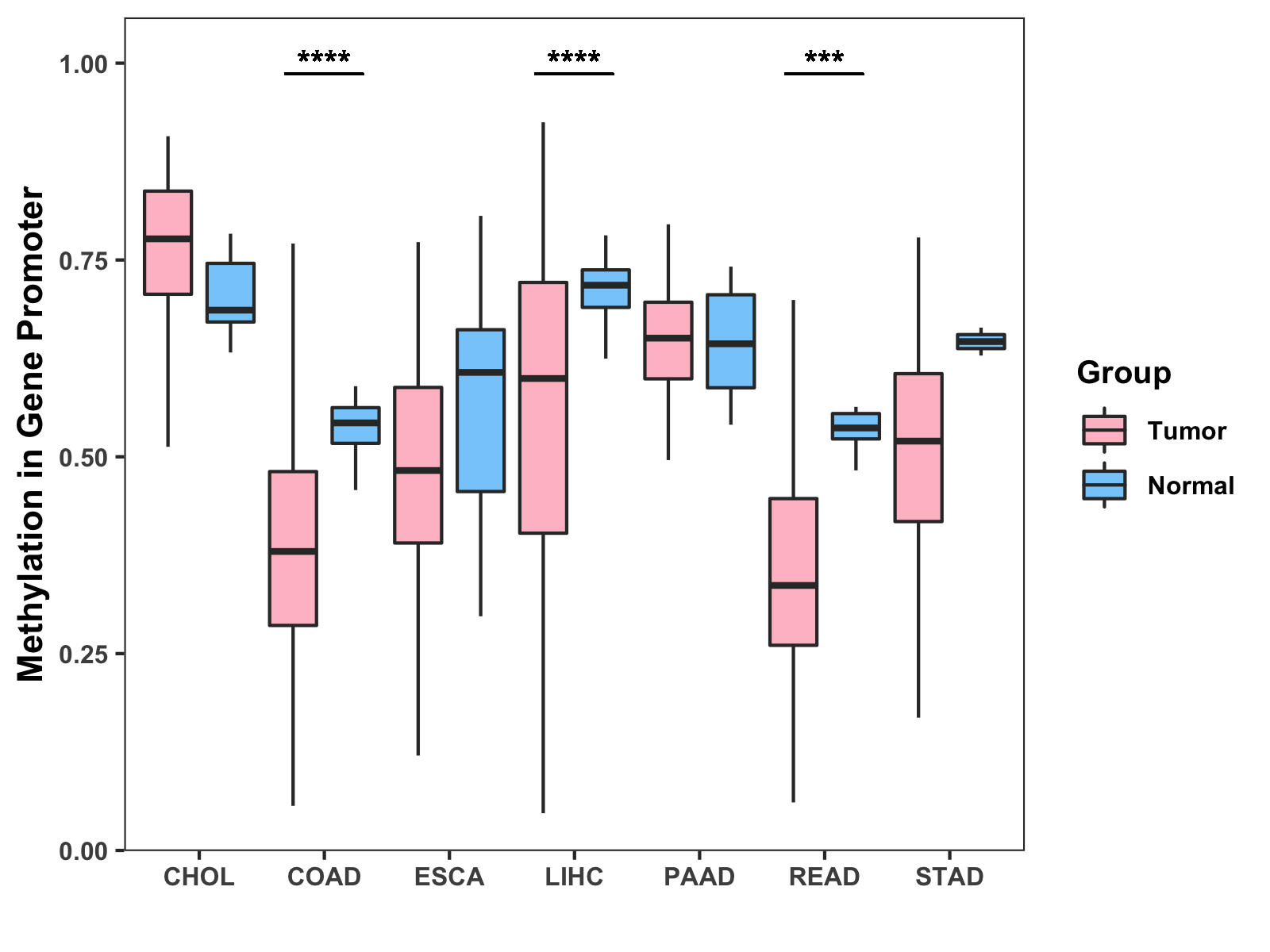 Boxplot of All Gastrointestinal Cancer ( * : 0.01-0.05 , ** : 0.005-0.01 , *** : 0.0001-0.005 , **** : < 0.0001 ) |