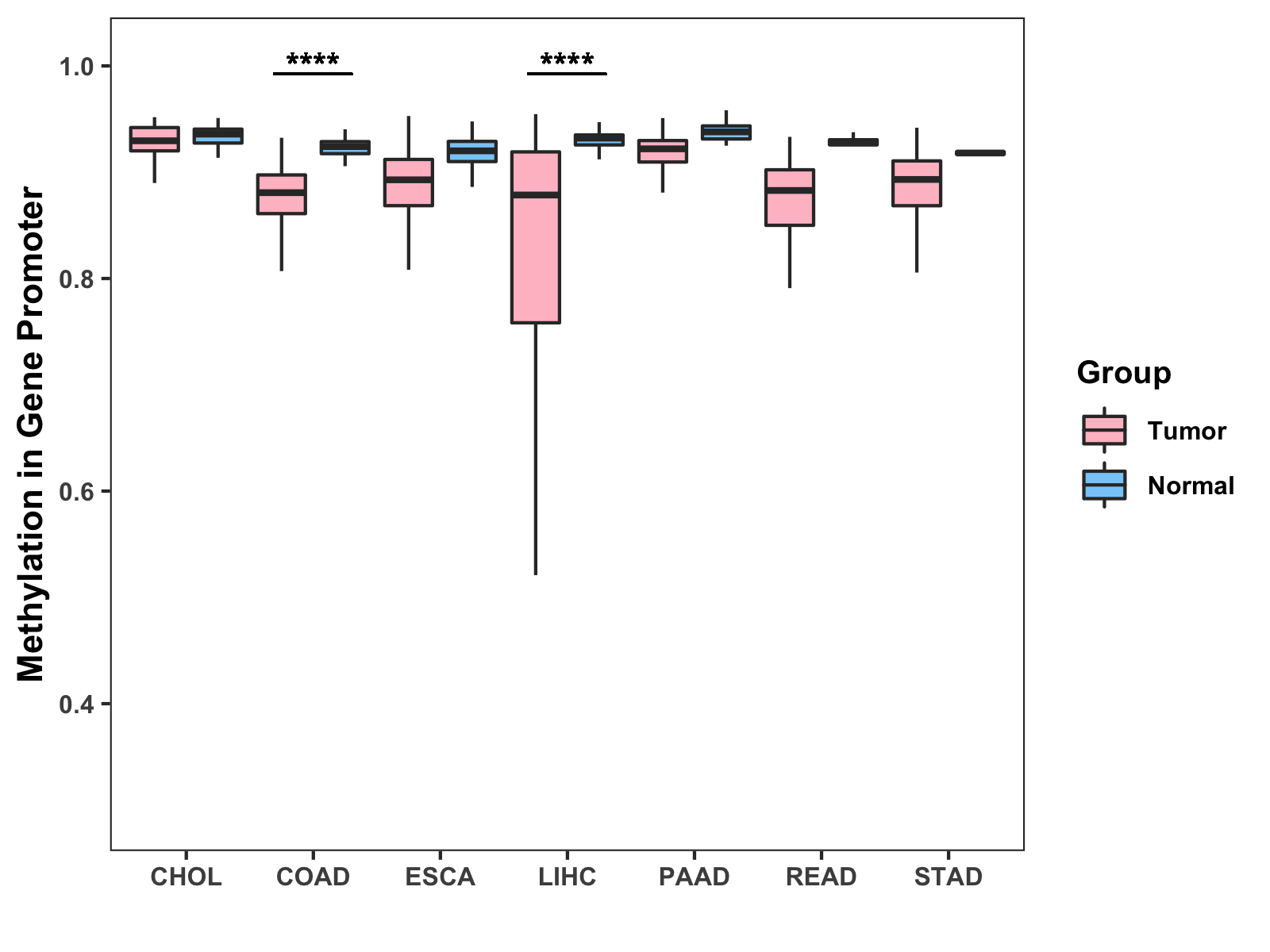 Boxplot of All Gastrointestinal Cancer ( * : 0.01-0.05 , ** : 0.005-0.01 , *** : 0.0001-0.005 , **** : < 0.0001 ) |
