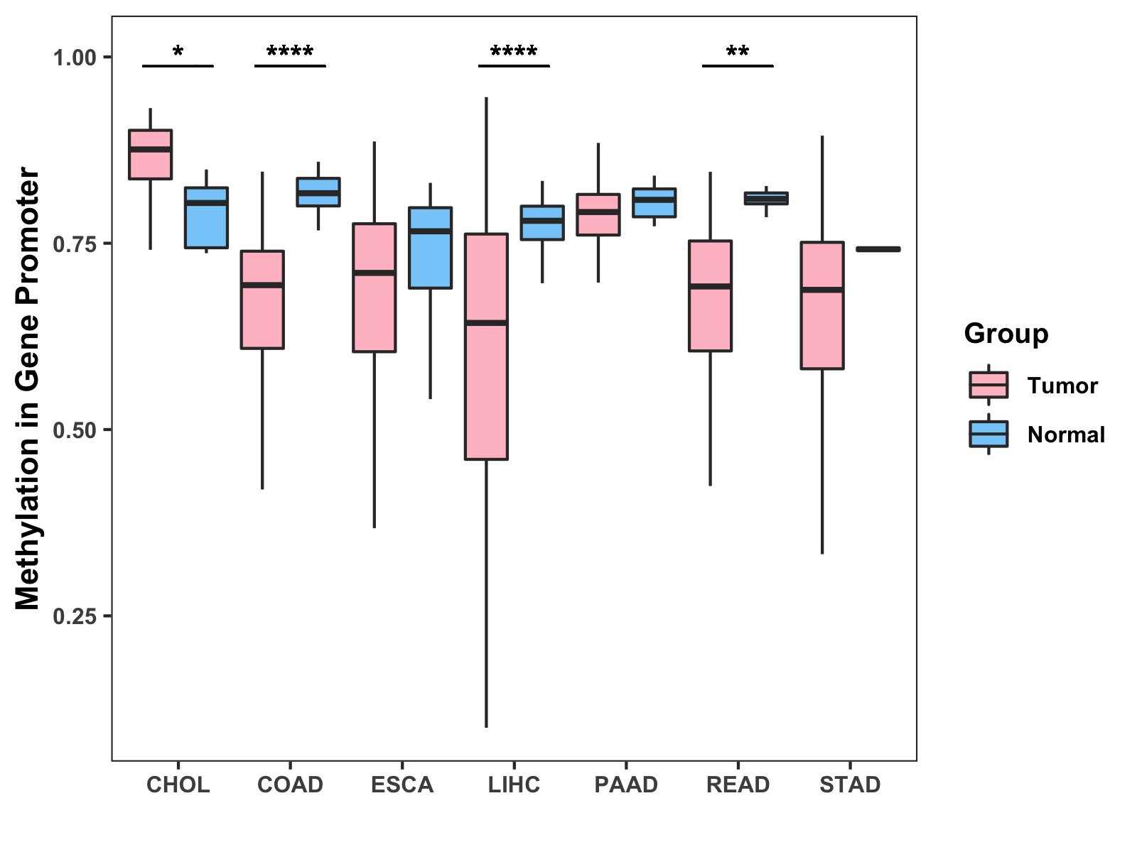 Boxplot of All Gastrointestinal Cancer ( * : 0.01-0.05 , ** : 0.005-0.01 , *** : 0.0001-0.005 , **** : < 0.0001 ) |