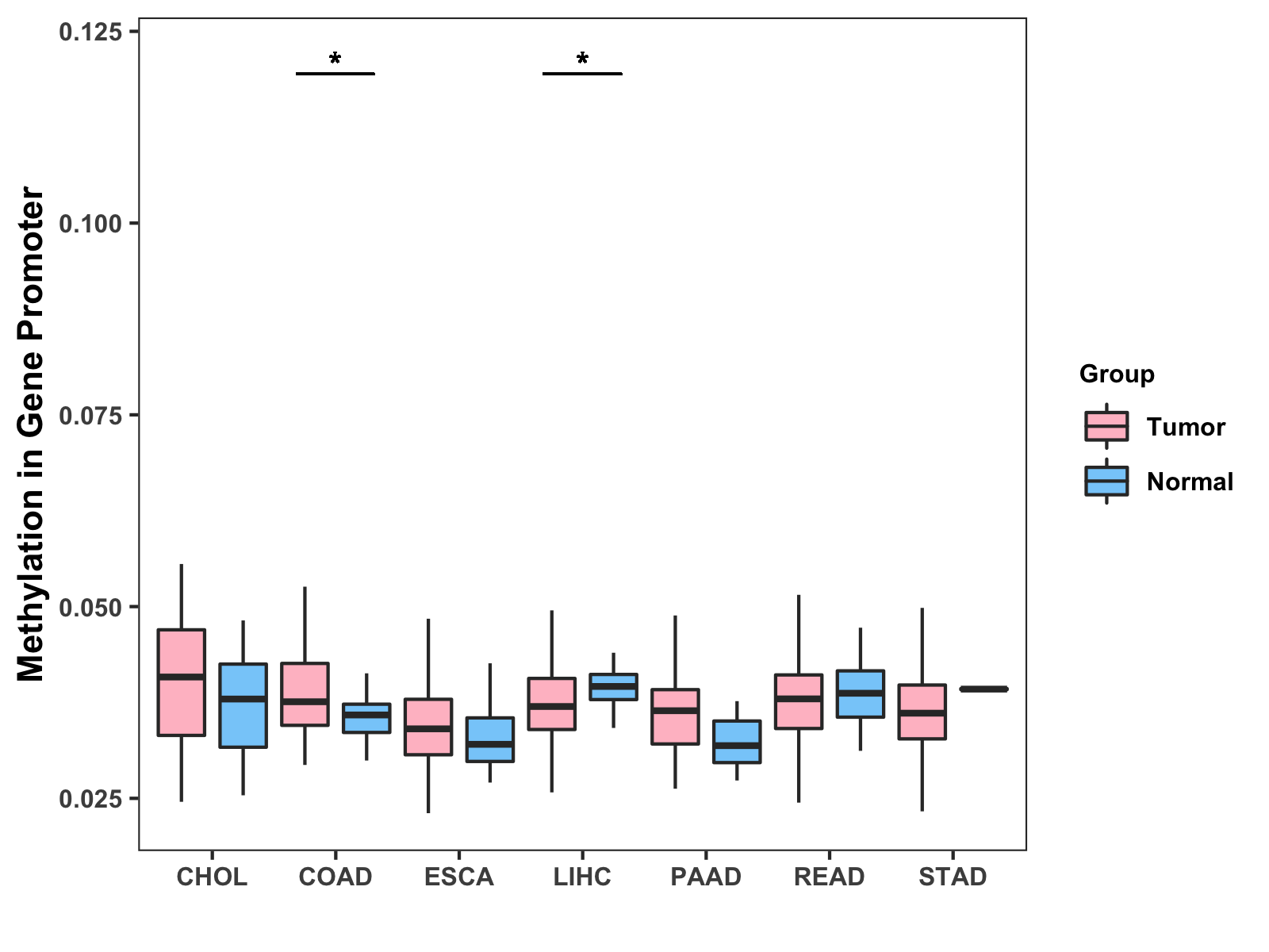Boxplot of All Gastrointestinal Cancer ( * : 0.01-0.05 , ** : 0.005-0.01 , *** : 0.0001-0.005 , **** : < 0.0001 ) |