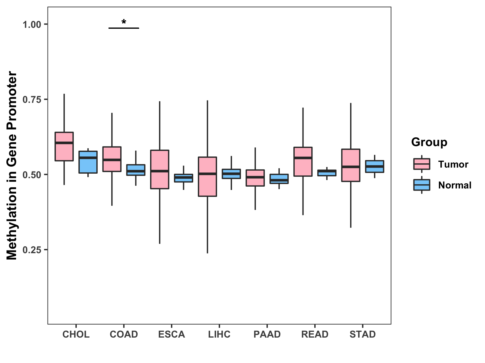 Boxplot of All Gastrointestinal Cancer ( * : 0.01-0.05 , ** : 0.005-0.01 , *** : 0.0001-0.005 , **** : < 0.0001 ) |