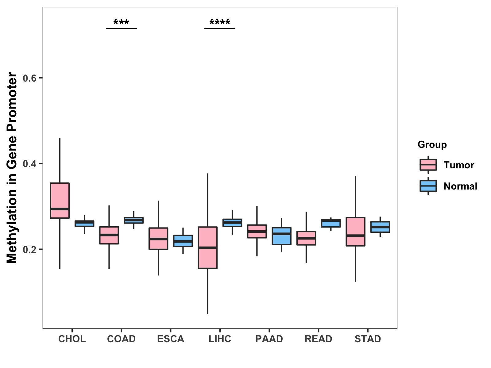 Boxplot of All Gastrointestinal Cancer ( * : 0.01-0.05 , ** : 0.005-0.01 , *** : 0.0001-0.005 , **** : < 0.0001 ) |