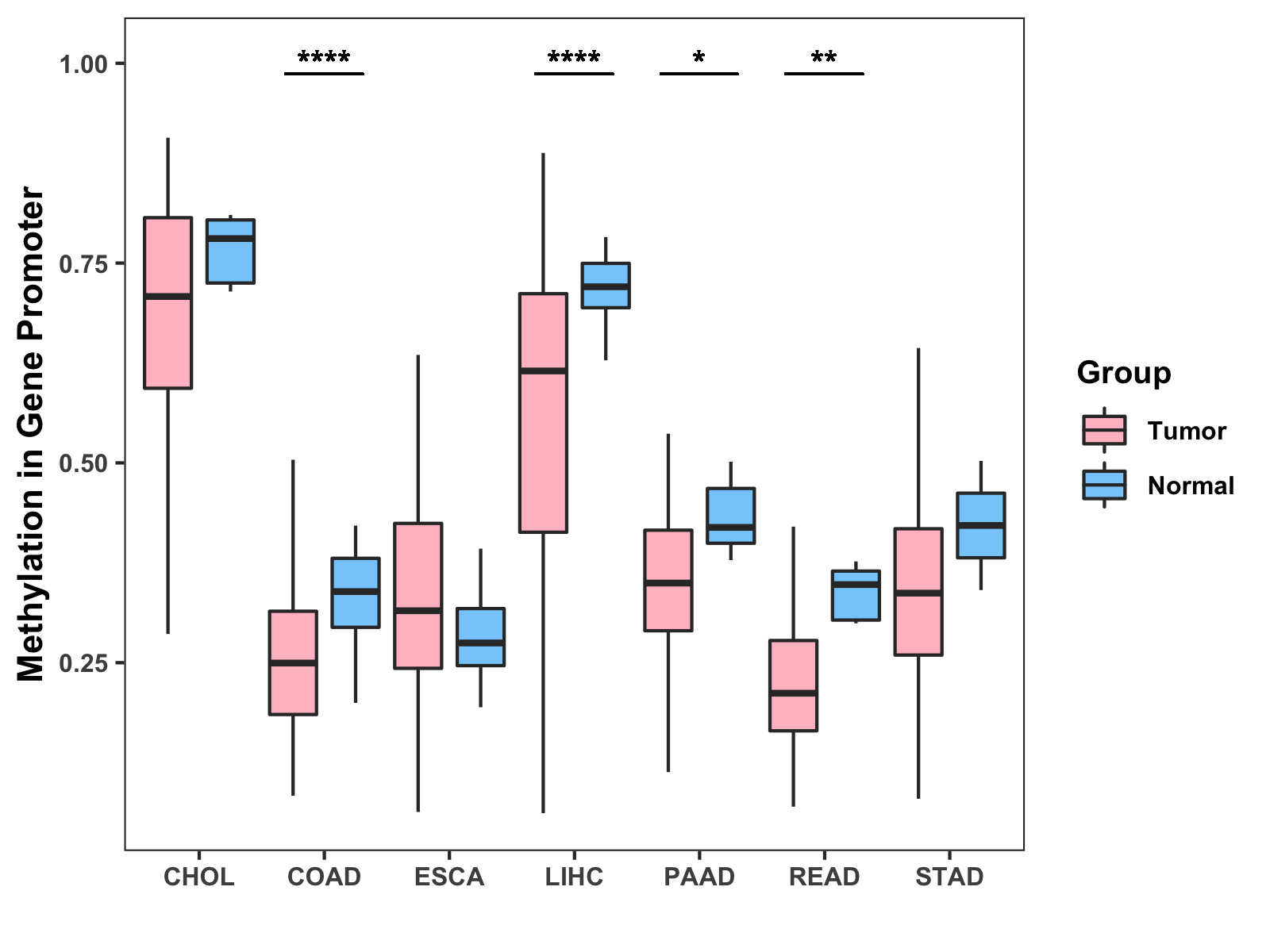 Boxplot of All Gastrointestinal Cancer ( * : 0.01-0.05 , ** : 0.005-0.01 , *** : 0.0001-0.005 , **** : < 0.0001 ) |