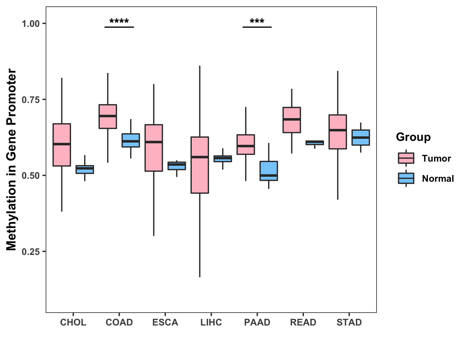 Boxplot of All Gastrointestinal Cancer ( * : 0.01-0.05 , ** : 0.005-0.01 , *** : 0.0001-0.005 , **** : < 0.0001 ) |