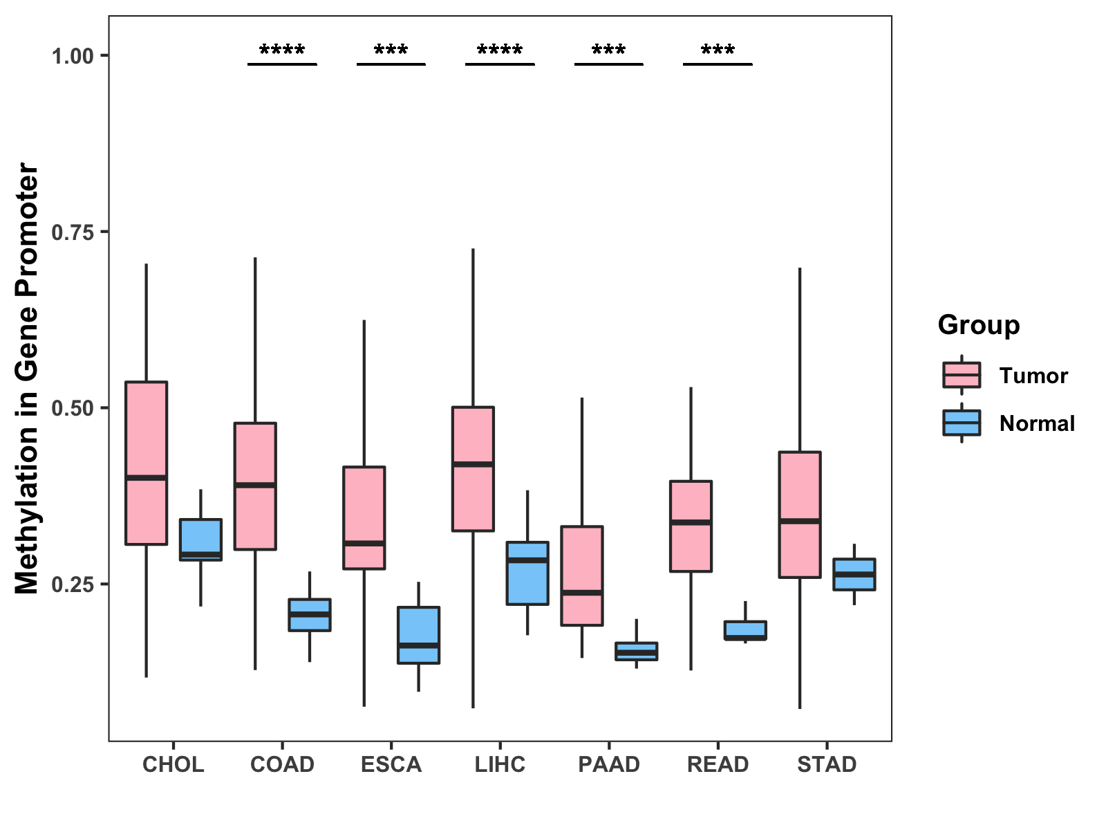 Boxplot of All Gastrointestinal Cancer ( * : 0.01-0.05 , ** : 0.005-0.01 , *** : 0.0001-0.005 , **** : < 0.0001 ) |