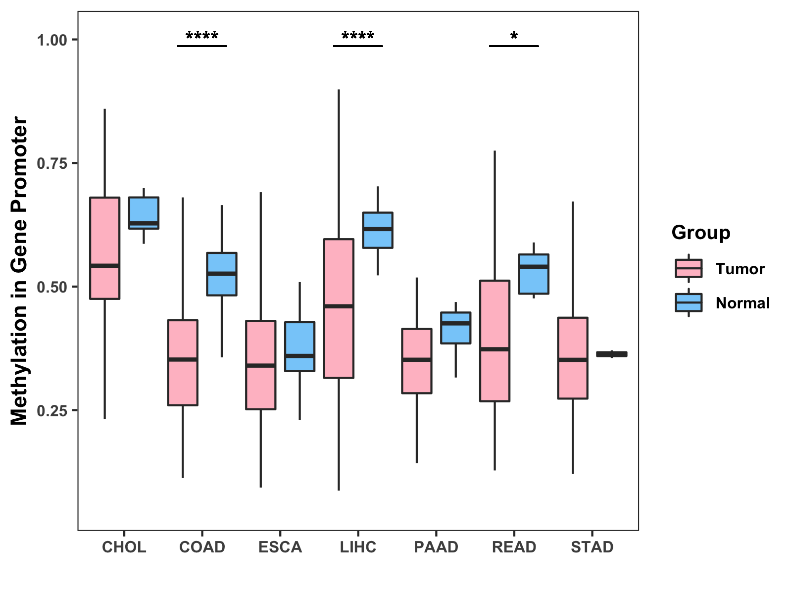 Boxplot of All Gastrointestinal Cancer ( * : 0.01-0.05 , ** : 0.005-0.01 , *** : 0.0001-0.005 , **** : < 0.0001 ) |
