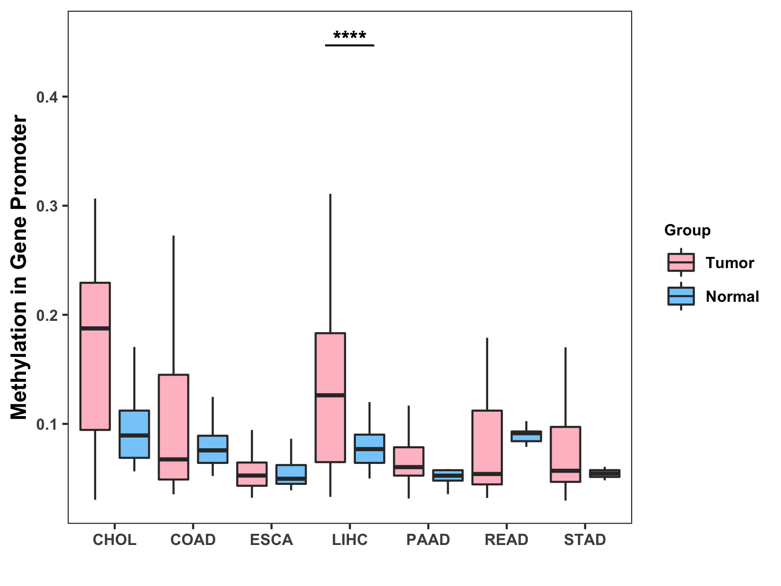 Boxplot of All Gastrointestinal Cancer ( * : 0.01-0.05 , ** : 0.005-0.01 , *** : 0.0001-0.005 , **** : < 0.0001 ) |