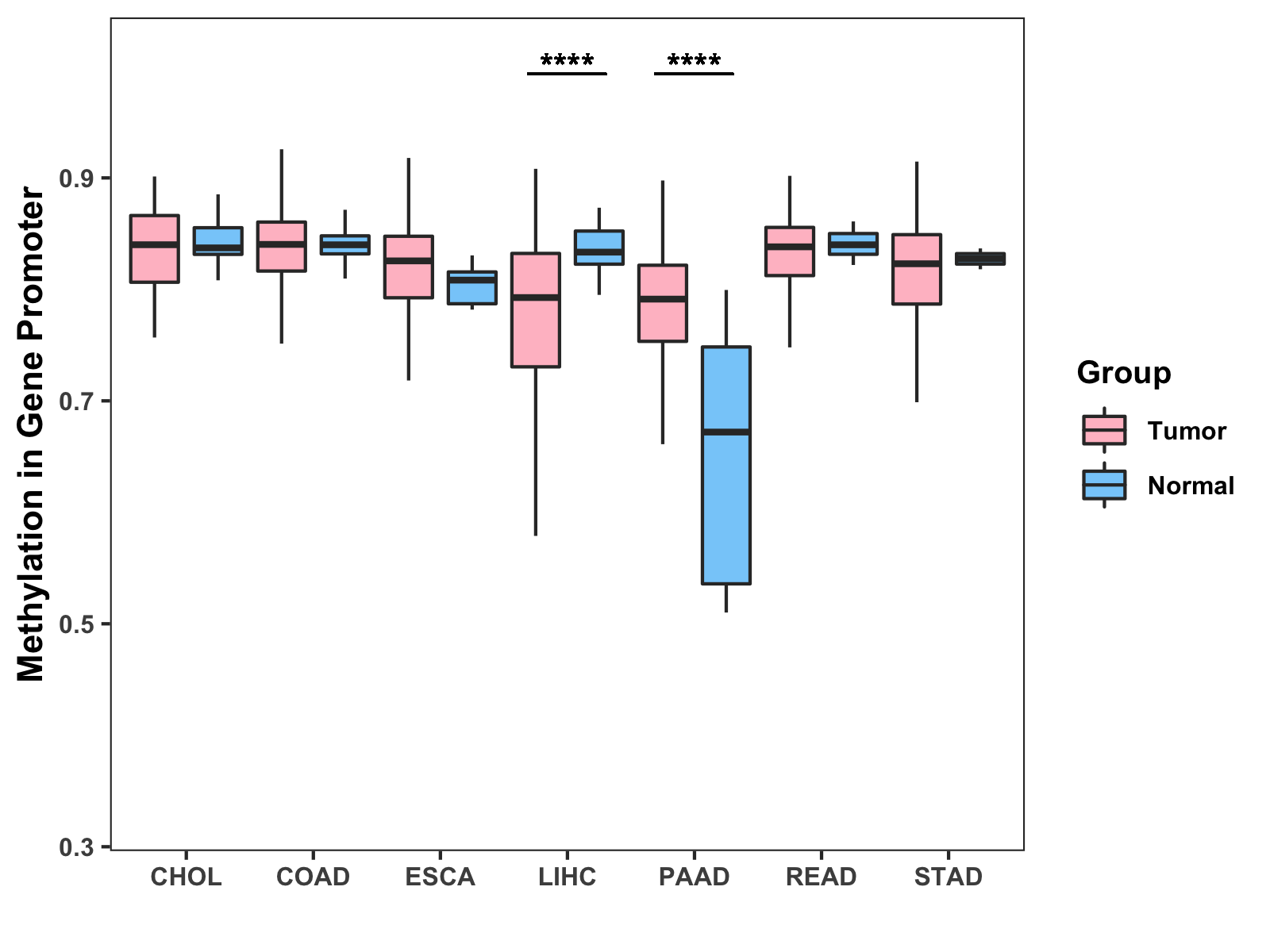 Boxplot of All Gastrointestinal Cancer ( * : 0.01-0.05 , ** : 0.005-0.01 , *** : 0.0001-0.005 , **** : < 0.0001 ) |