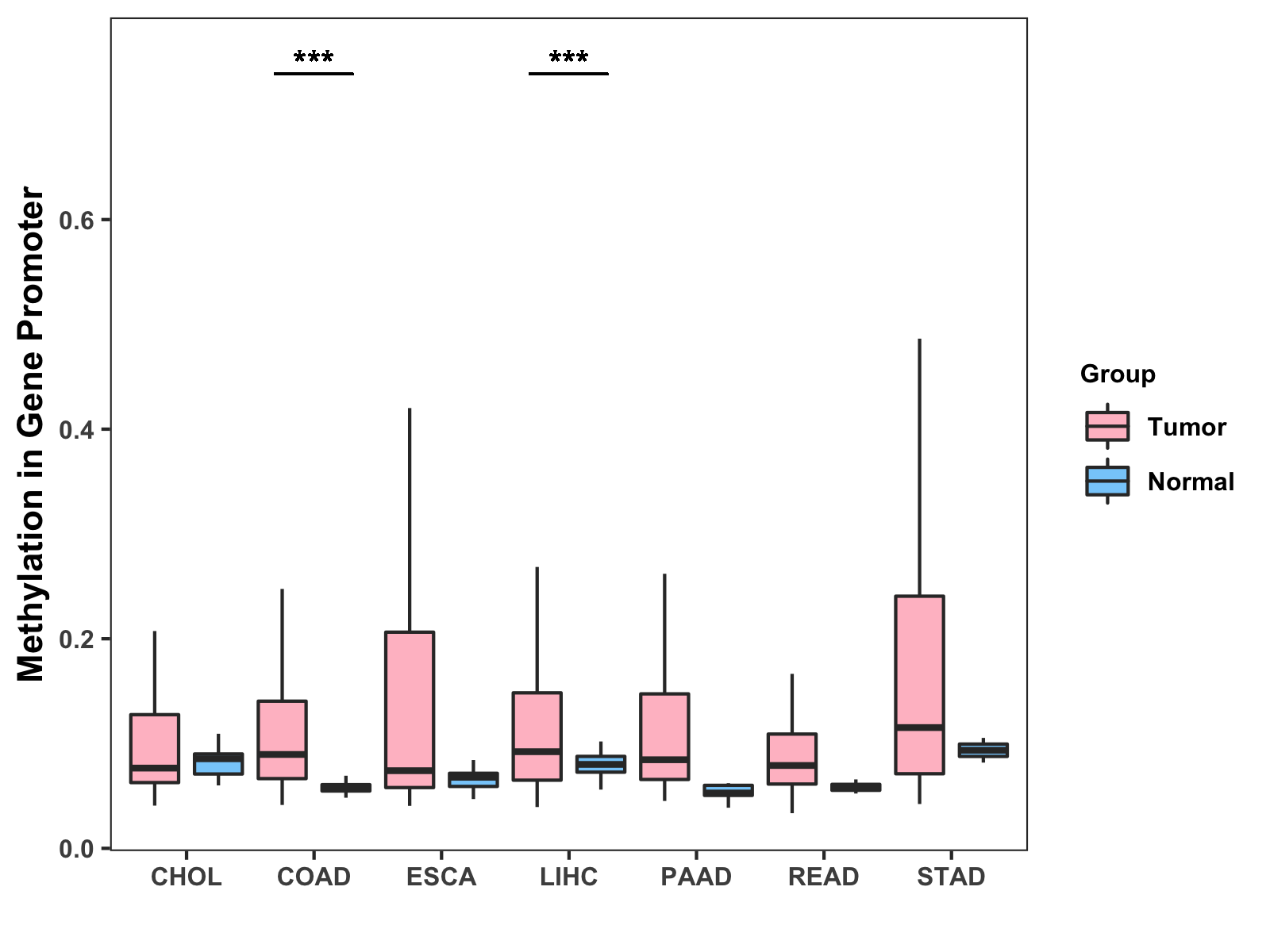 Boxplot of All Gastrointestinal Cancer ( * : 0.01-0.05 , ** : 0.005-0.01 , *** : 0.0001-0.005 , **** : < 0.0001 ) |
