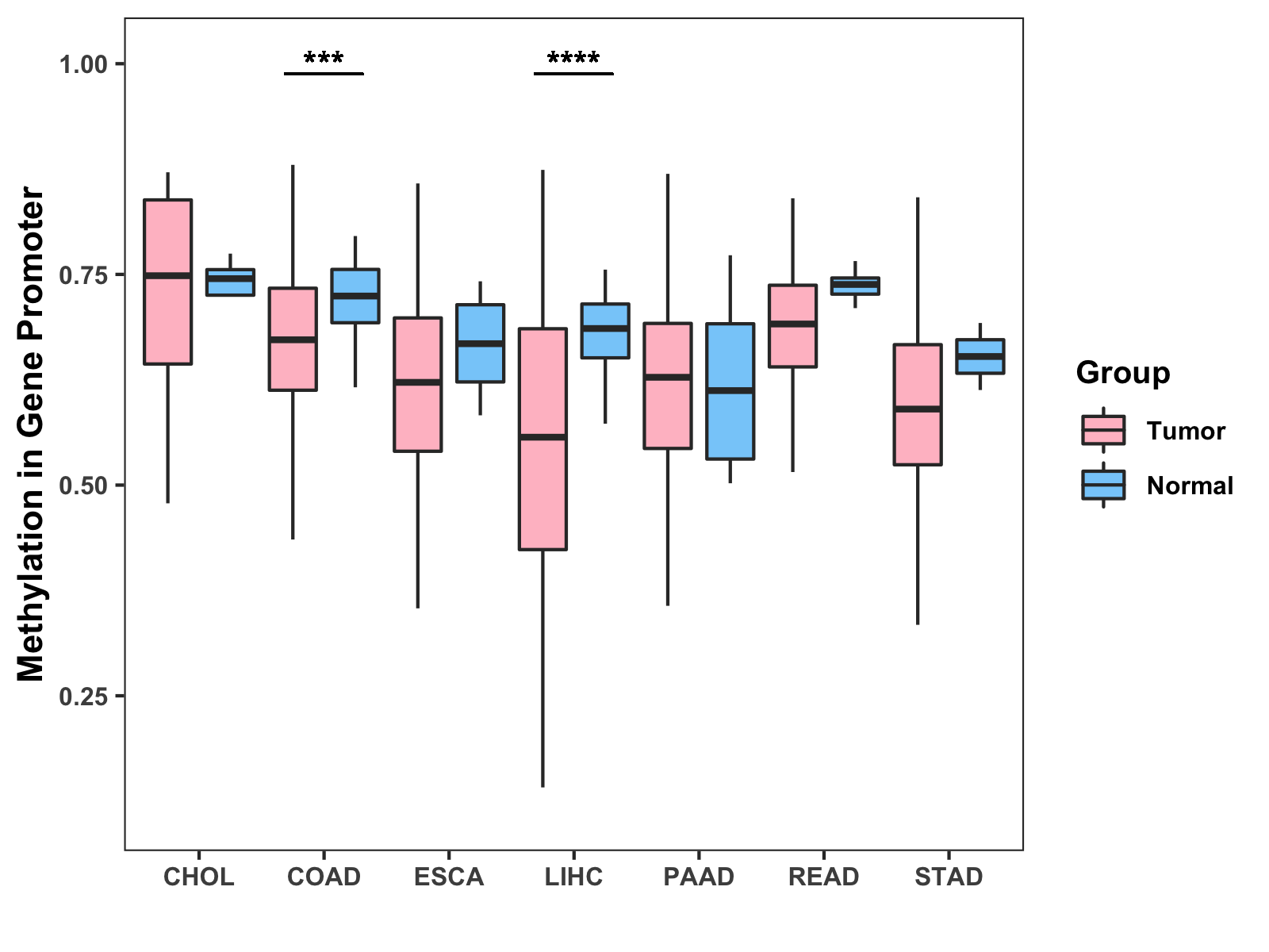 Boxplot of All Gastrointestinal Cancer ( * : 0.01-0.05 , ** : 0.005-0.01 , *** : 0.0001-0.005 , **** : < 0.0001 ) |