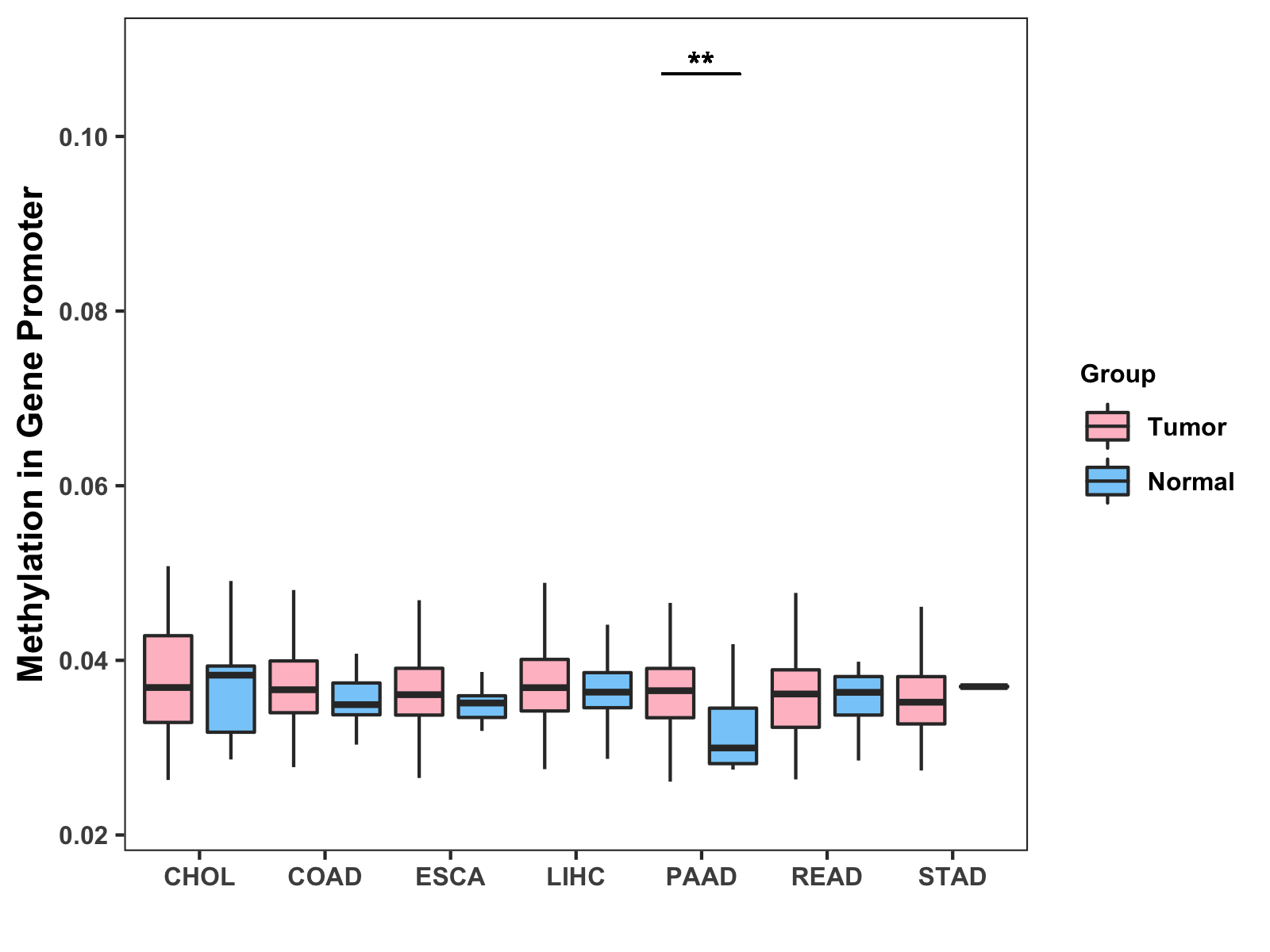 Boxplot of All Gastrointestinal Cancer ( * : 0.01-0.05 , ** : 0.005-0.01 , *** : 0.0001-0.005 , **** : < 0.0001 ) |