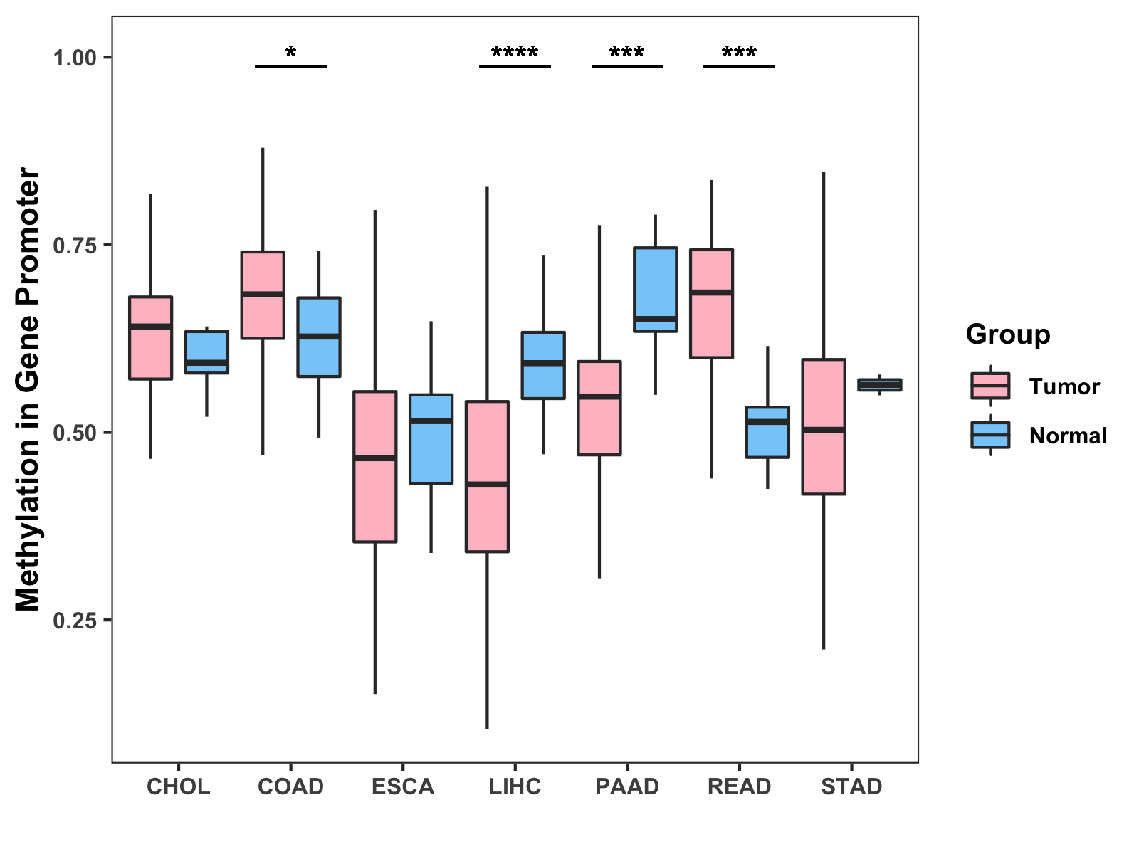 Boxplot of All Gastrointestinal Cancer ( * : 0.01-0.05 , ** : 0.005-0.01 , *** : 0.0001-0.005 , **** : < 0.0001 ) |