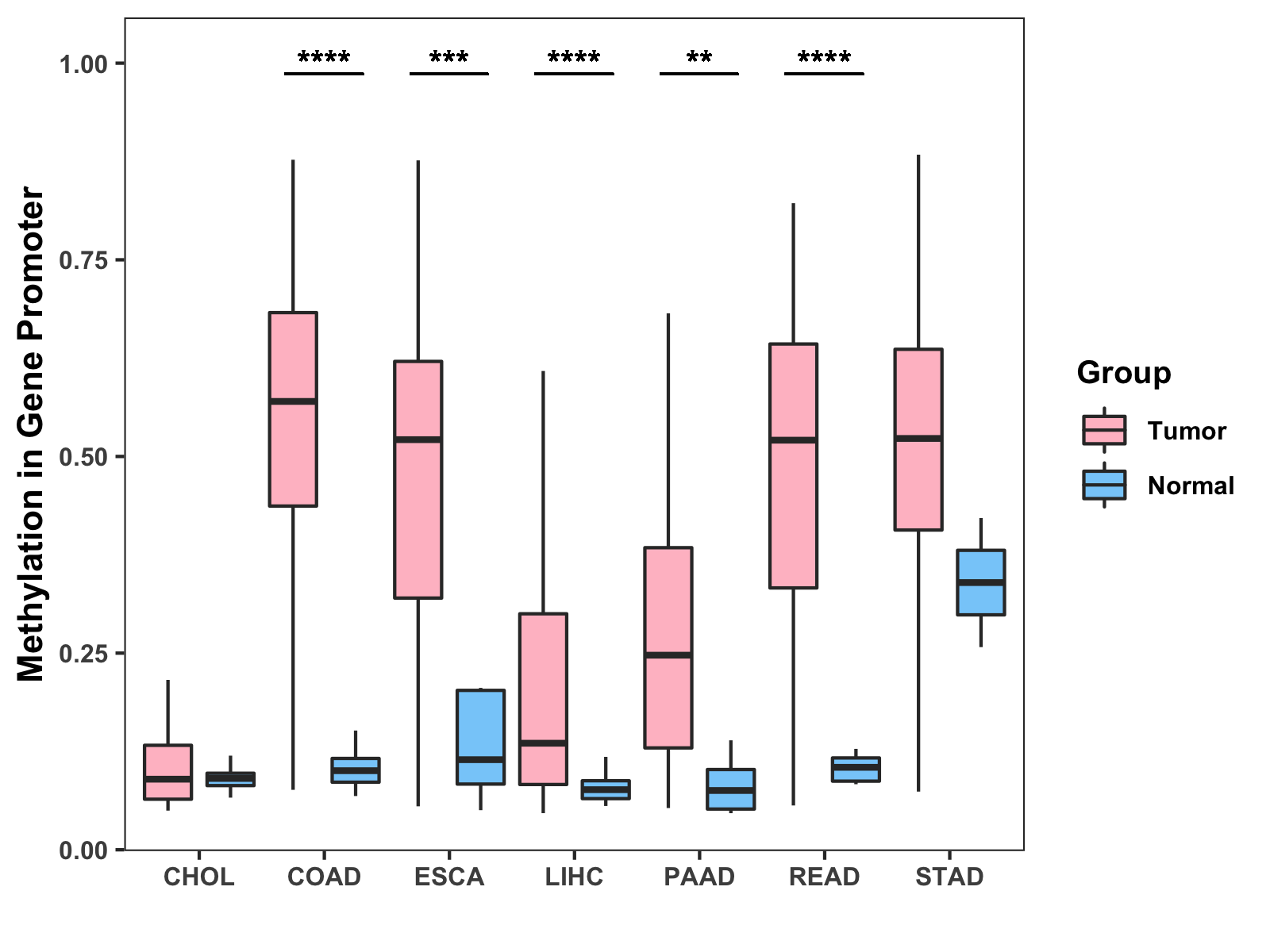 Boxplot of All Gastrointestinal Cancer ( * : 0.01-0.05 , ** : 0.005-0.01 , *** : 0.0001-0.005 , **** : < 0.0001 ) |