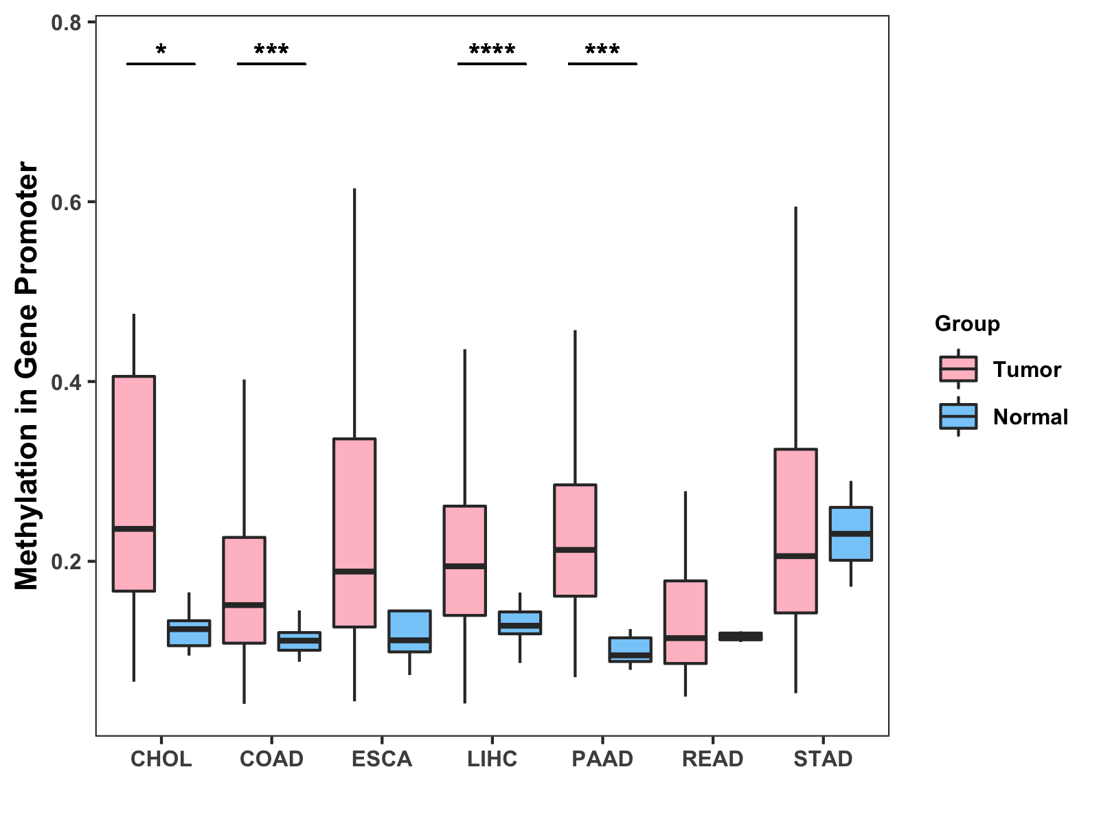 Boxplot of All Gastrointestinal Cancer ( * : 0.01-0.05 , ** : 0.005-0.01 , *** : 0.0001-0.005 , **** : < 0.0001 ) |