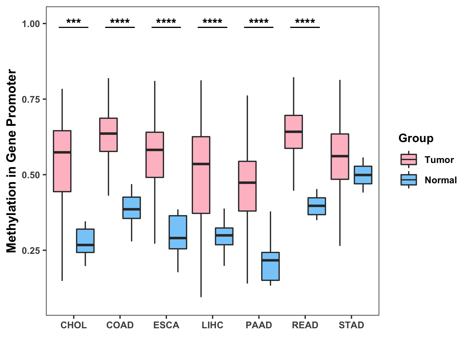Boxplot of All Gastrointestinal Cancer ( * : 0.01-0.05 , ** : 0.005-0.01 , *** : 0.0001-0.005 , **** : < 0.0001 ) |