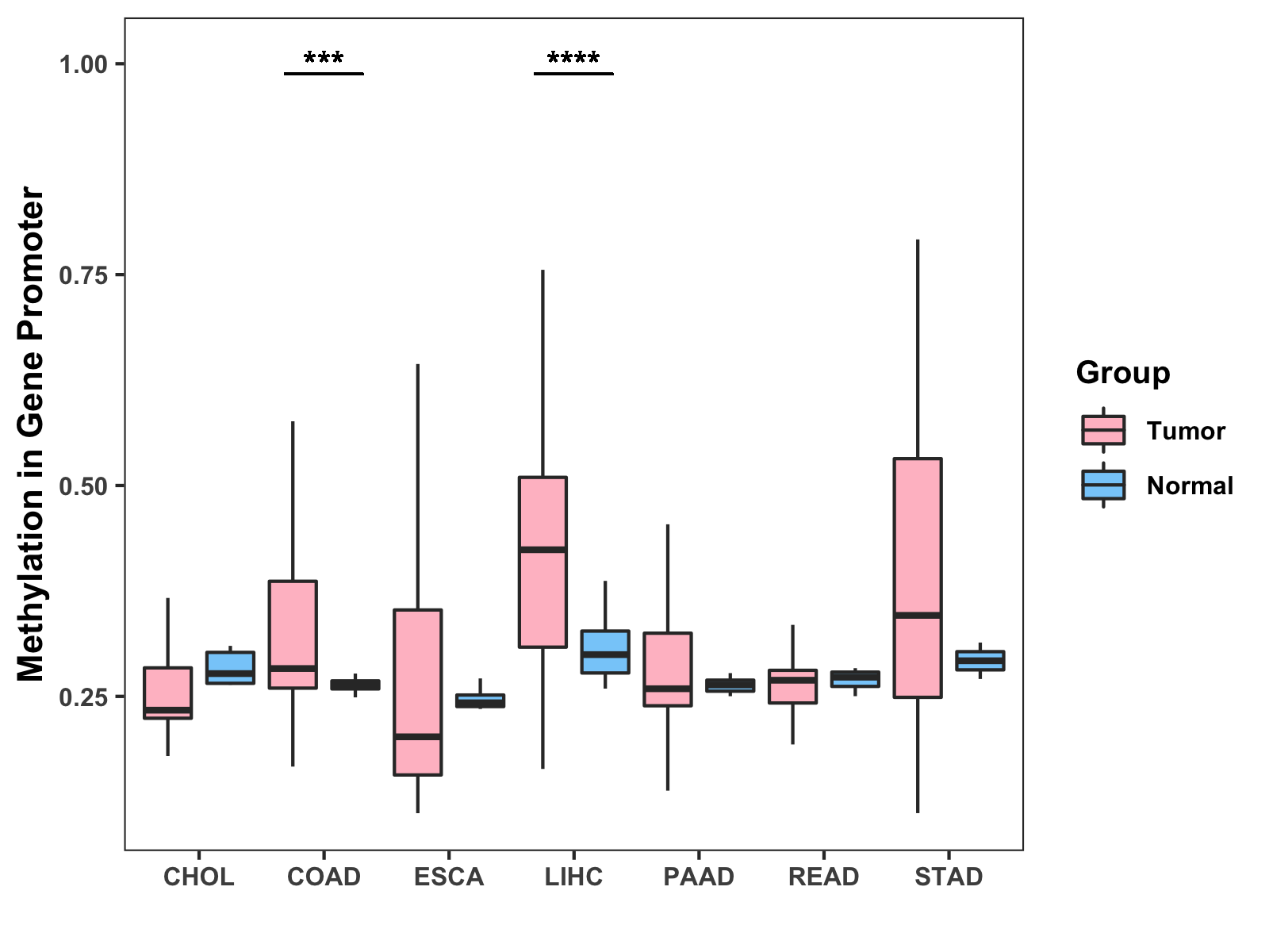Boxplot of All Gastrointestinal Cancer ( * : 0.01-0.05 , ** : 0.005-0.01 , *** : 0.0001-0.005 , **** : < 0.0001 ) |