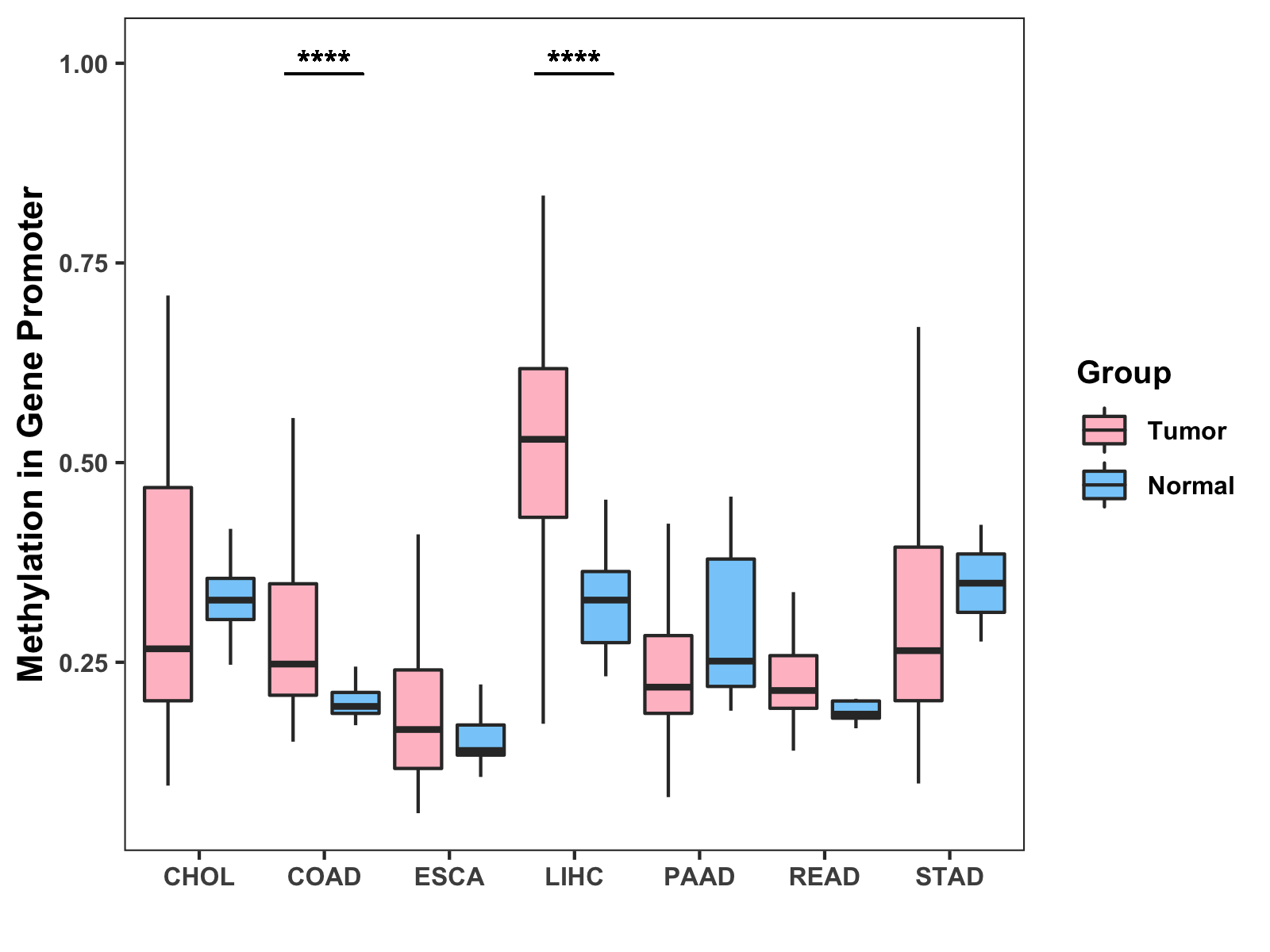 Boxplot of All Gastrointestinal Cancer ( * : 0.01-0.05 , ** : 0.005-0.01 , *** : 0.0001-0.005 , **** : < 0.0001 ) |