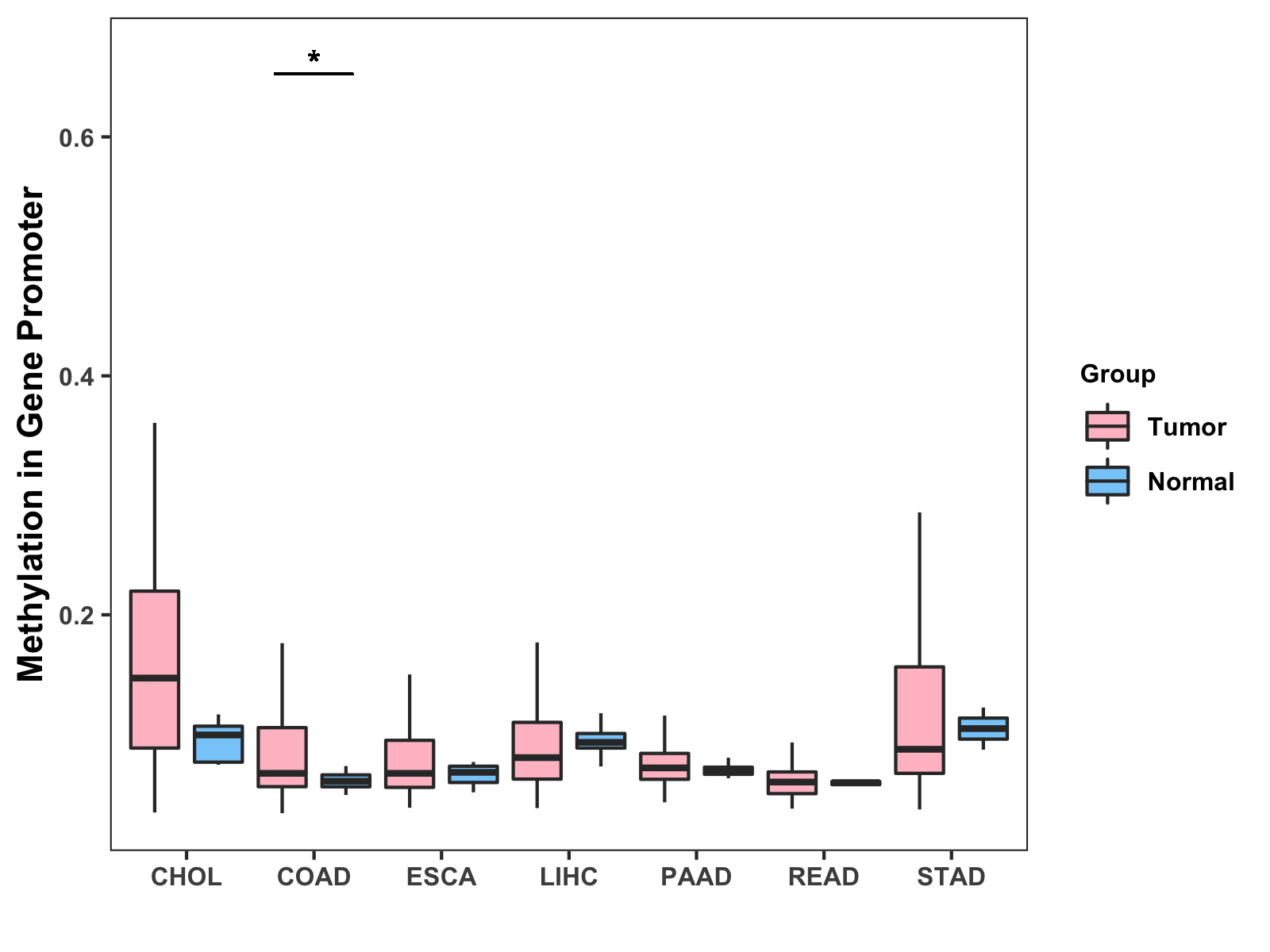 Boxplot of All Gastrointestinal Cancer ( * : 0.01-0.05 , ** : 0.005-0.01 , *** : 0.0001-0.005 , **** : < 0.0001 ) |