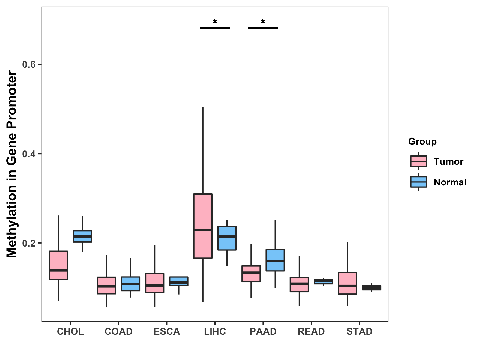 Boxplot of All Gastrointestinal Cancer ( * : 0.01-0.05 , ** : 0.005-0.01 , *** : 0.0001-0.005 , **** : < 0.0001 ) |