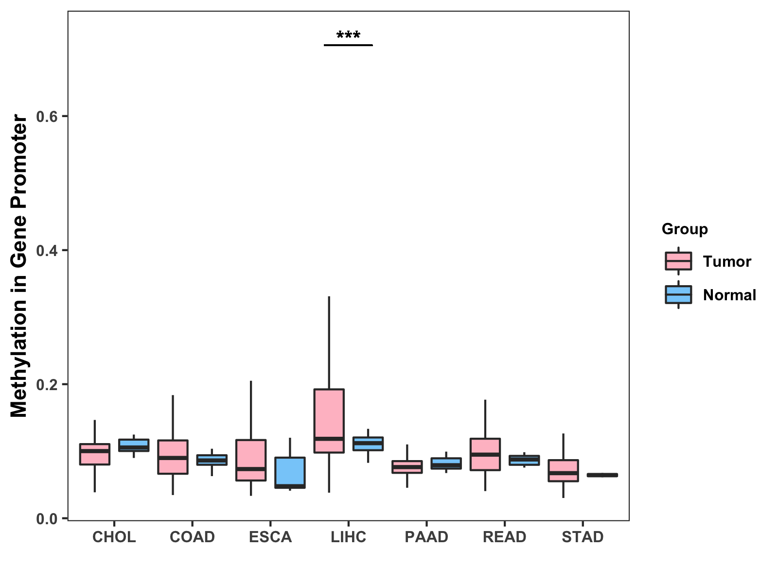 Boxplot of All Gastrointestinal Cancer ( * : 0.01-0.05 , ** : 0.005-0.01 , *** : 0.0001-0.005 , **** : < 0.0001 ) |