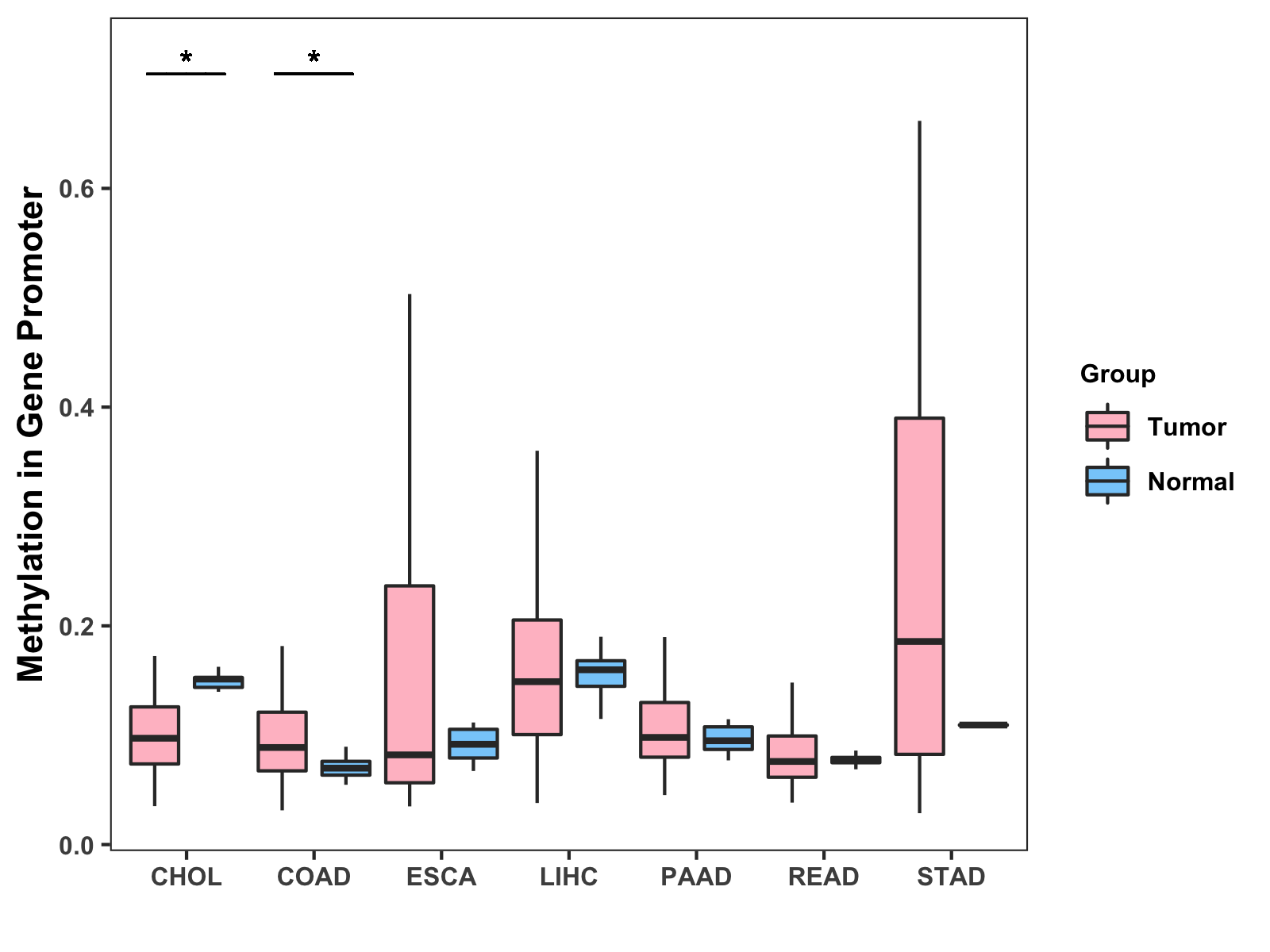 Boxplot of All Gastrointestinal Cancer ( * : 0.01-0.05 , ** : 0.005-0.01 , *** : 0.0001-0.005 , **** : < 0.0001 ) |