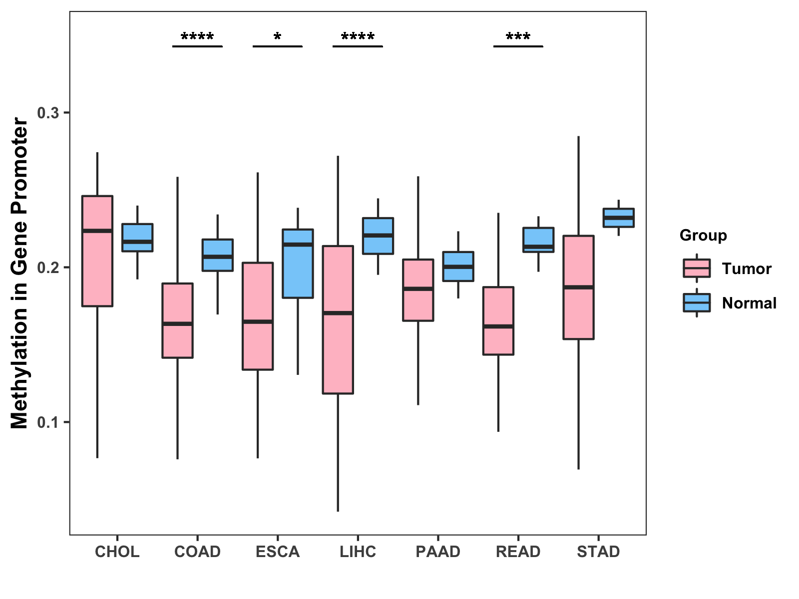 Boxplot of All Gastrointestinal Cancer ( * : 0.01-0.05 , ** : 0.005-0.01 , *** : 0.0001-0.005 , **** : < 0.0001 ) |